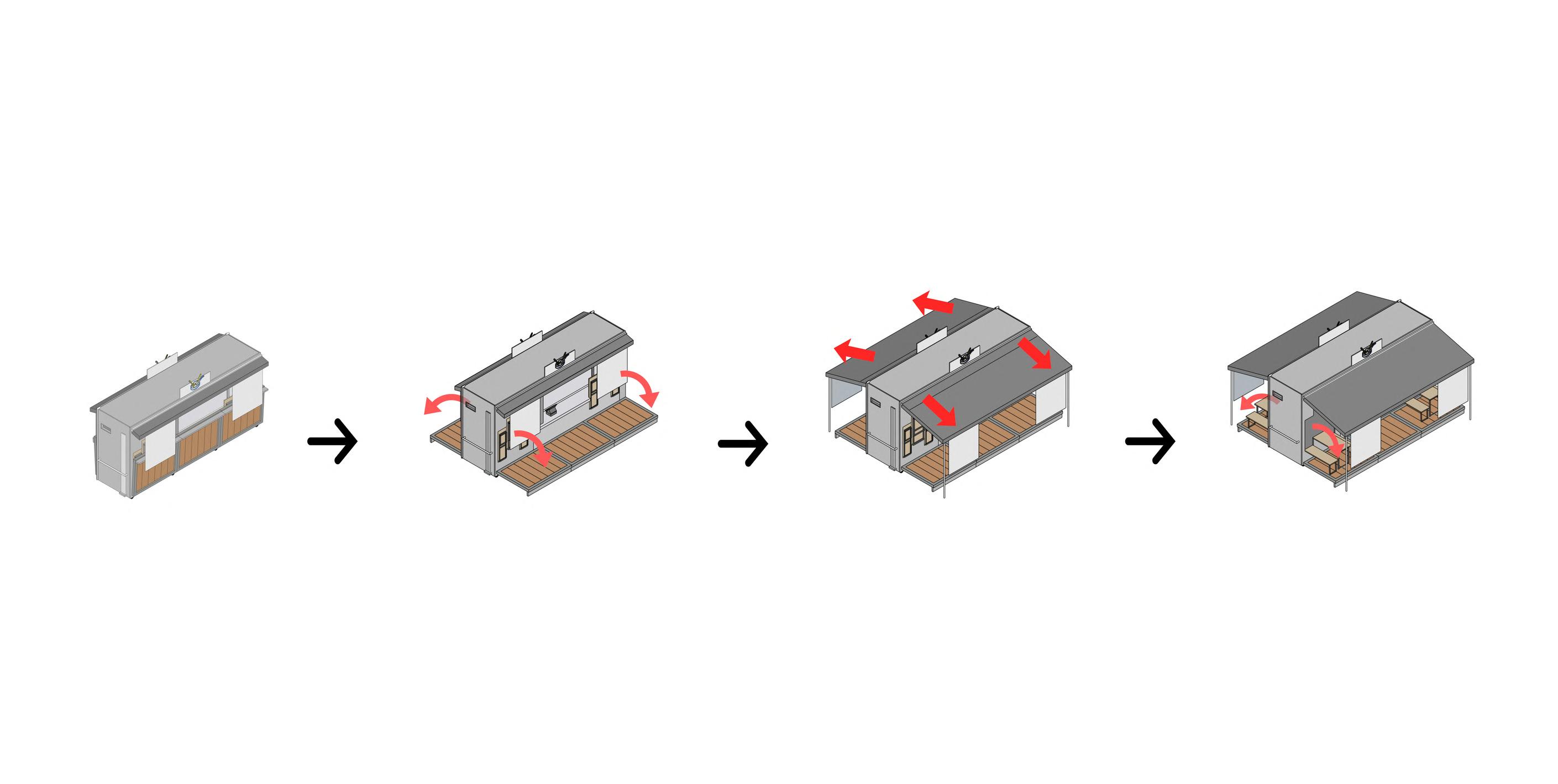 design concept that is modular, modern, and innovative by he locality of the typical Lamongan dining tent. This design is hat the culinary experience in a tent for both sellers and buyers t from what has become a tradition in Indonesia. The shape and of the module are an abstraction from the Lamongan dining tent portable and mobile system, where the trading cart carrying the able, and dining chairs can move quickly.