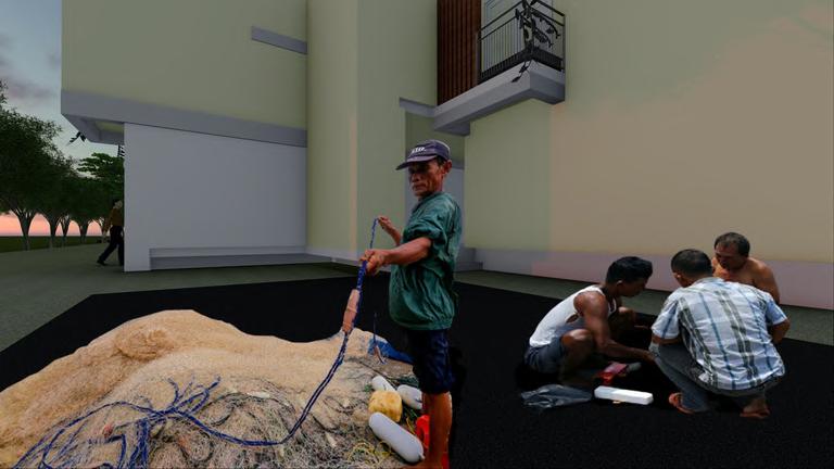 The density of fishing villages around the Sunda Kelapa Harbour makes housing conditions in these villages slums so that it is difficult for people to find decent housing. This flat was built with the concept of sustainable architecture, where this house was made with the aim of helping meet the facilities needed by the community, especially those who work as fishermen to still be able to live with facilities that are fulfilled both from housing to facilities to meet their daily needs. Fisherman's Flats are made with a simple house typology according to the surrounding residential buildings. Due to the fact that around the port there is already a place for fish processing, this flats only provides a place for the community to sell processed fish as one of the livelihoods when conditions are not possible to find fish in the sea.