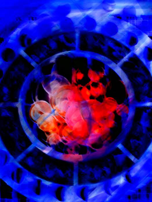 Intensive. Cette technique inspirée des origines de la photographie est basée sur un long temps d’obturation et une chromie inverse des couleurs. Ils s’intéressent à la photographie qui révèle les forces invisibles des sujets qu’ils approchent. La création de passerelles entre l’art et la science fait partie de leurs préoccupations continues. Ils explorent actuellement les vitraux avec la même approche nous invitant à une expérience sensible du verre.