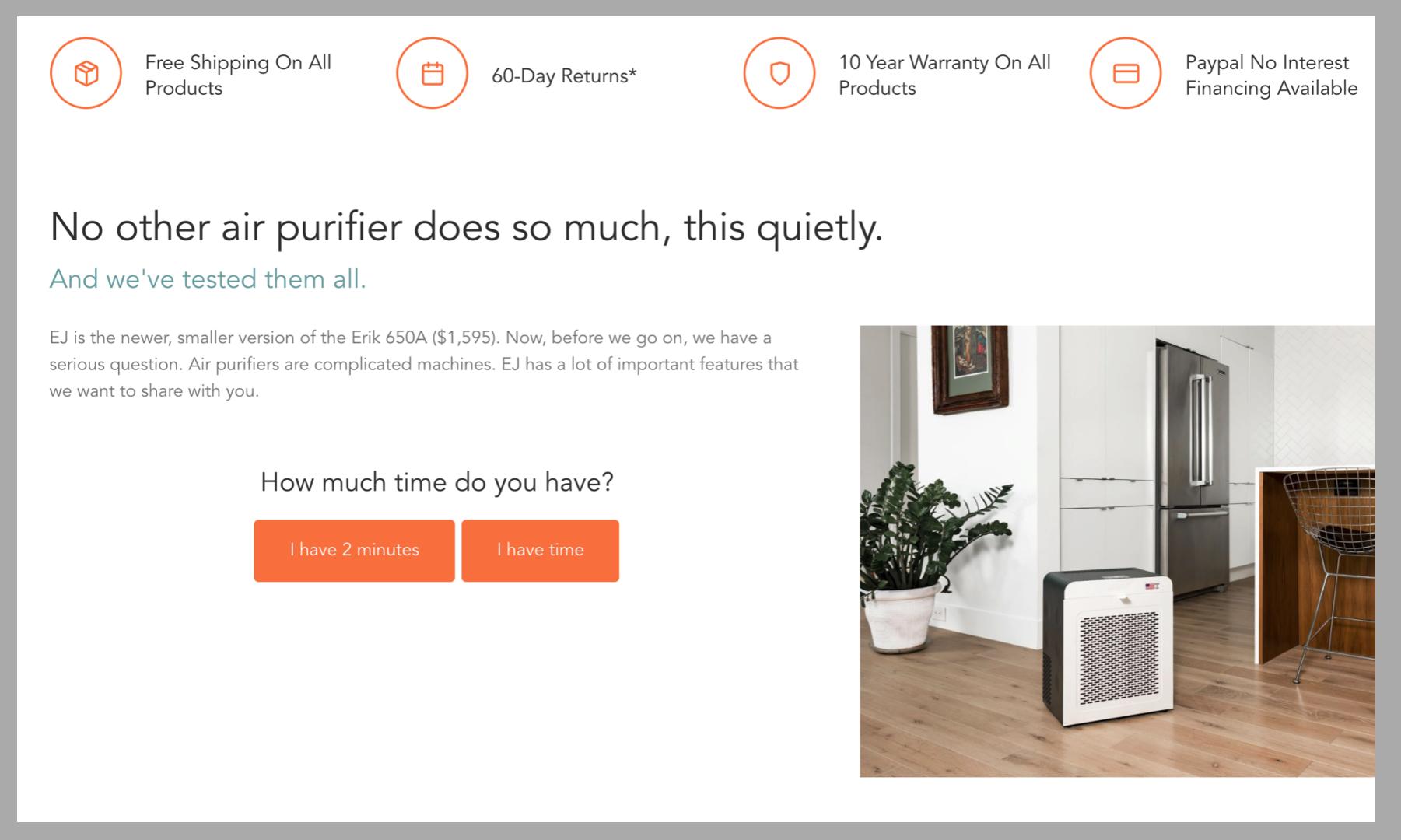 Product details are pushed further down the page so visitors aren’t forced to look at them first without knowing the company.