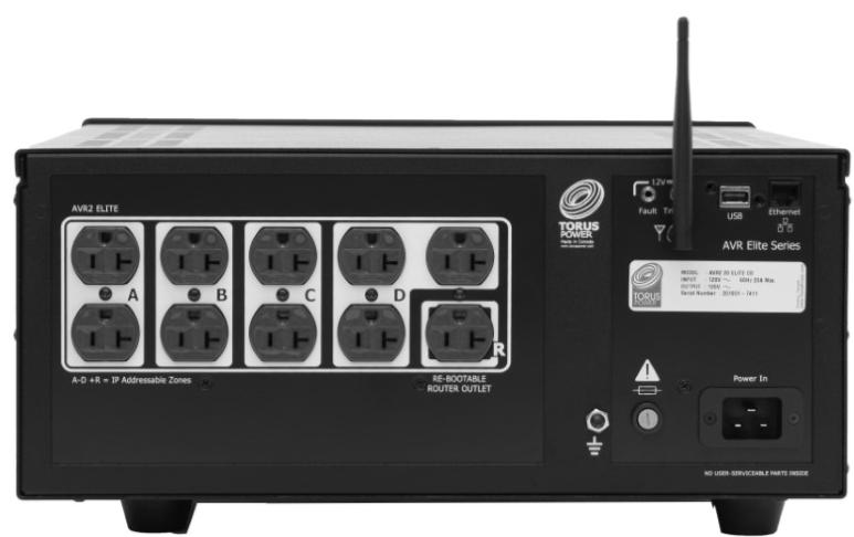 The back face of the AVR Elite bears 10 receptacles for power cords, an IEC receptacle for the AVR Elite’s power cord, an ethernet port, a USB connector, and a 10A input fuse.