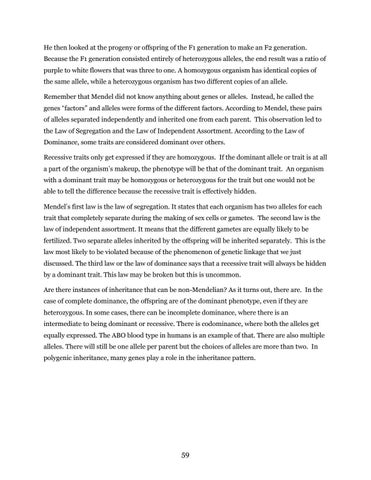 He then looked at the progeny or offspring of the F1 generation to make an F2 generation. Because the F1 generation consisted entirely of heterozygous alleles, the end result was a ratio of purple to white flowers that was three to one. A homozygous organism has identical copies of the same allele, while a heterozygous organism has two different copies of an allele. Remember that Mendel did not know anything about genes or alleles. Instead, he called the genes factors” and alleles were forms of the different factors. According to Mendel, these pairs of alleles separated independently and inherited one from each parent. This observation led to the Law of Segregation and the Law of Independent Assortment. According to the Law of Dominance, some traits are considered dominant over others. Recessive traits only get expressed if they are homozygous. If the dominant allele or trait is at all a part of the organism s makeup, the phenotype will be that of the dominant trait. An organism with a dominant trait may be homozygous or heterozygous for the trait but one would not be able to tell the difference because the recessive trait is effectively hidden. Mendel s first law is the law of segregation. It states that each organism has two alleles for each trait that completely separate during the making of sex cells or gametes. The second law is the law of independent assortment. It means that the different gametes are equally likely to be fertilized. Two separate alleles inherited by the offspring will be inherited separately. This is the law most likely to be violated because of the phenomenon of genetic linkage that we just discussed. The third law or the law of dominance says that a recessive trait will always be hidden by a dominant trait. This law may be broken but this is uncommon. Are there instances of inheritance that can be non-Mendelian? As it turns out, there are. In the case of complete dominance, the offspring are of the dominant phenotype, even if they are heterozygous. In some cases, there can be incomplete dominance, where there is an intermediate to being dominant or recessive. There is codominance, where both the alleles get equally expressed. The ABO blood type in humans is an example of that. There are also multiple alleles. There will still be one allele per parent but the choices of alleles are more than two. In polygenic inheritance, many genes play a role in the inheritance pattern.