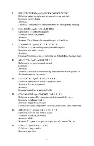 COLLISION - [spell]- C O L L I S I O N Definition: a violent rushing against Synonym: concussion, impact Antonym: Sentence: The collision of the cars damaged both vehicles.