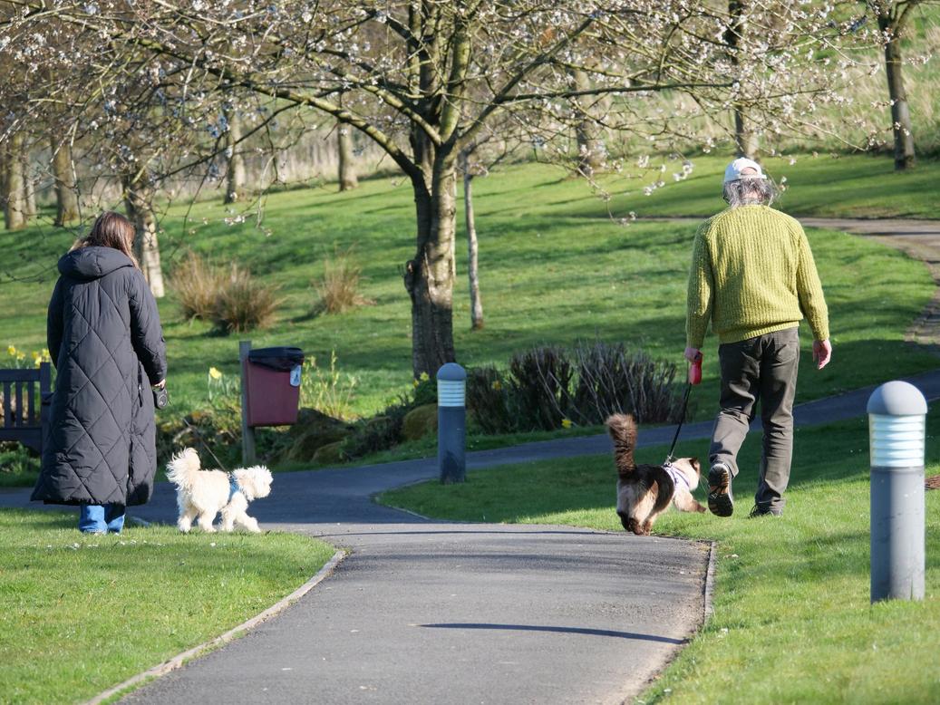 Oberon often walks with Pippi, a MaltesePoodle mix. The unlikely duo has become a charming sight around Clevedon, regularly stopping for chats and strokes from passersby