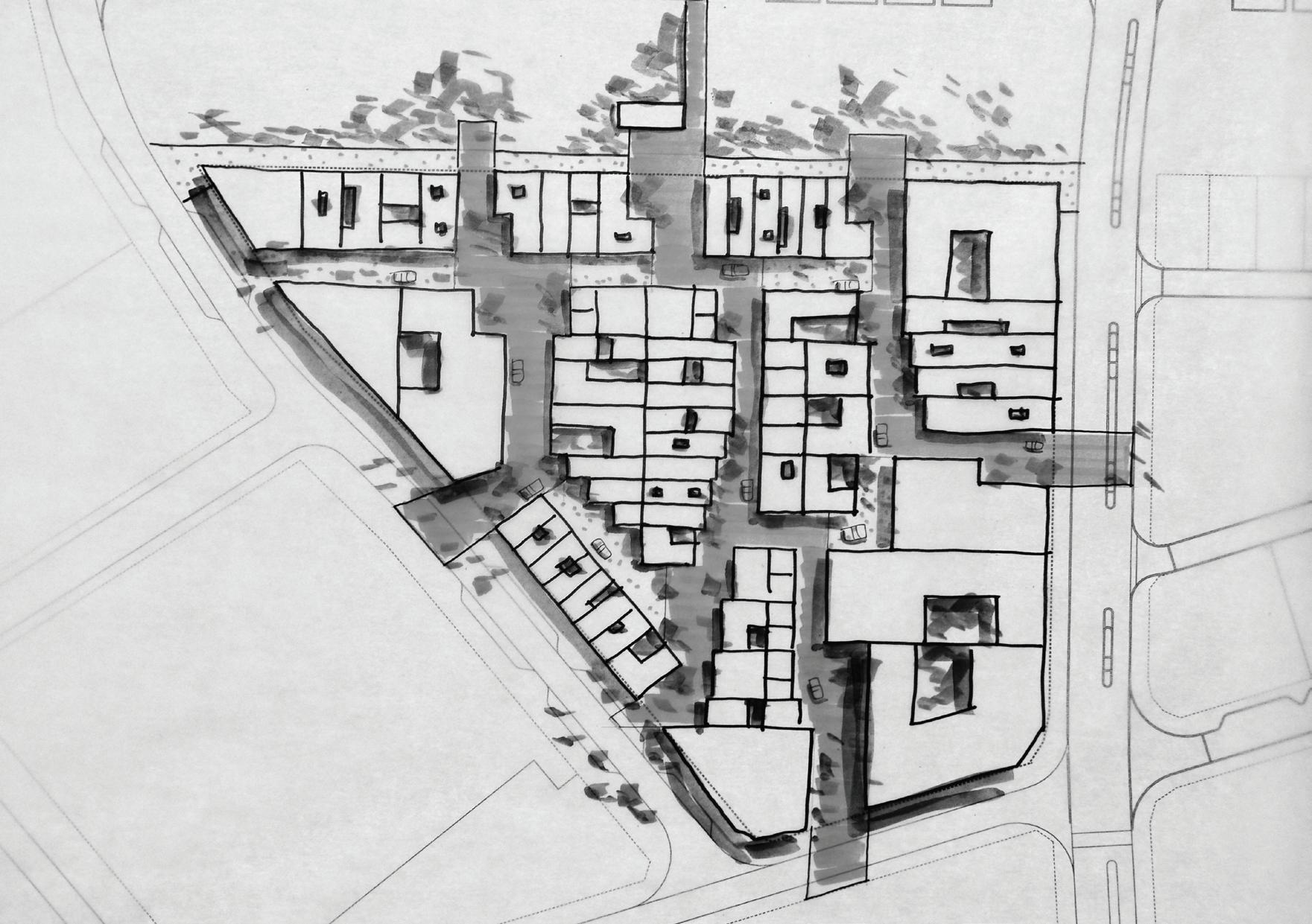 design principles were adopted to structure the development. East-west running lanes/ small streets were regarded as important for providing vehicle permeability, north facing building orientation, and general legibility.