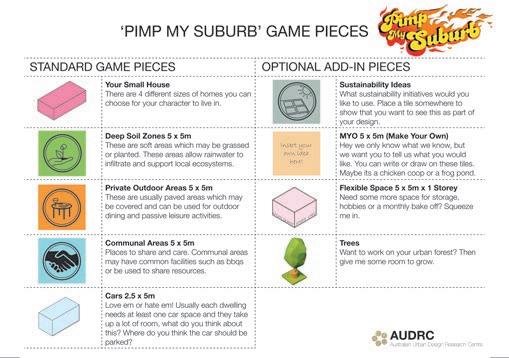 The choice of scale of the model/game is critical and relates to the spatial concepts which need to be examined and explored. For example when designing the suburban infill game the scale was determined by the need to examine interactions with neighbours as well as explore common controls which influenced built form on individual lots.