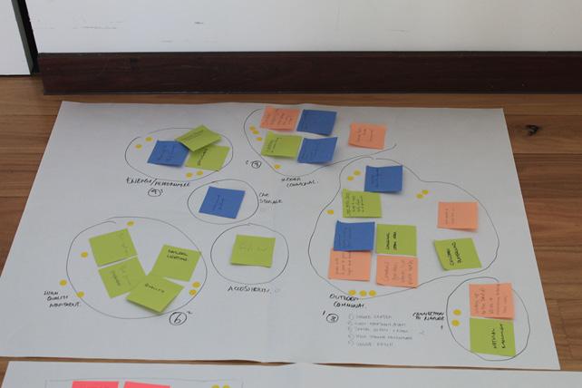 The gameplay involved a collaborative group visioning exercise followed by a facilitated building exercise. The visioning exercise asked participants to write down three features that they would like to see in the shared and/or communal areas on separate note pages. These were then fixed to a large sheet of paper and grouped into thematic clusters.
