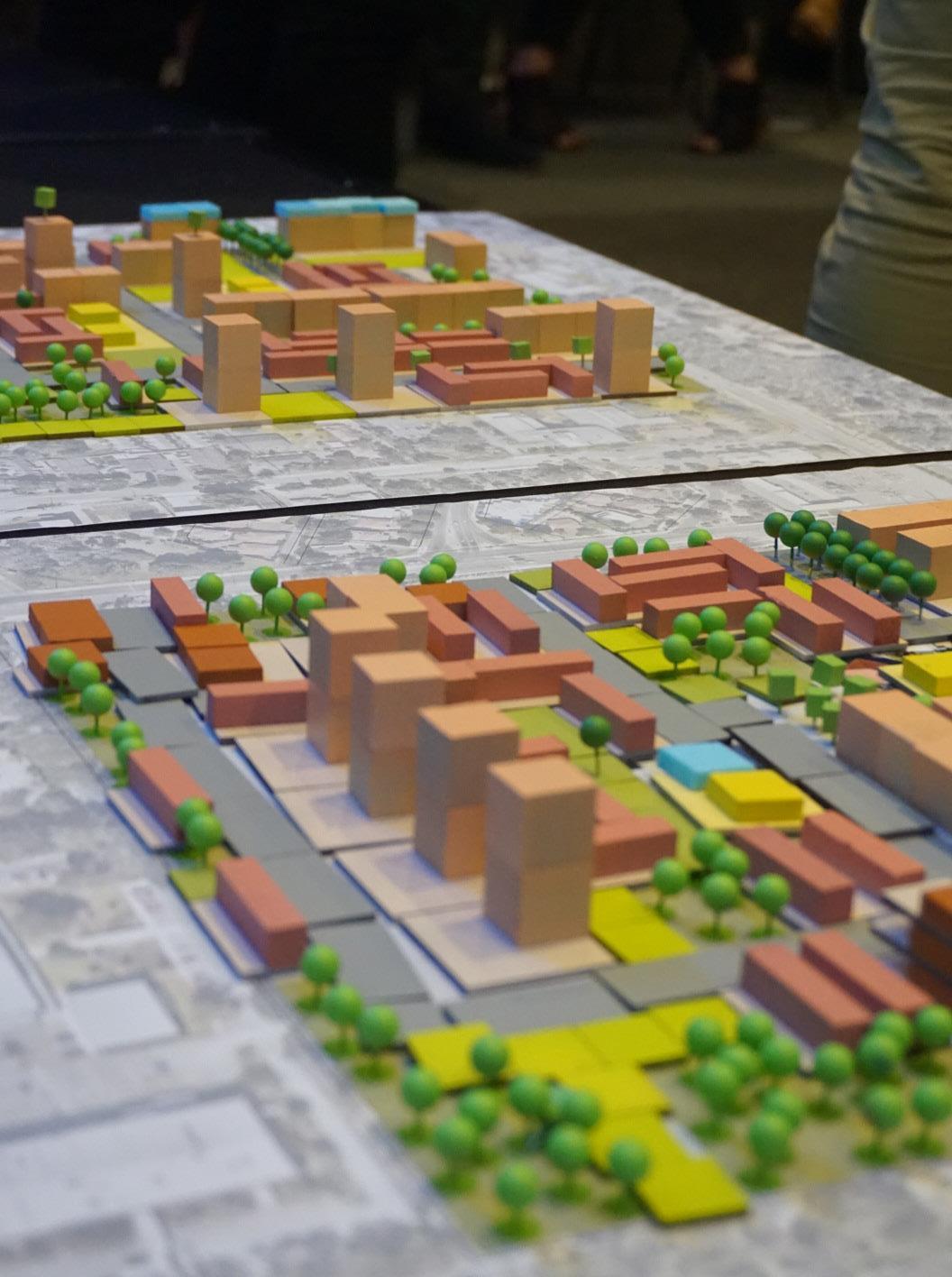 The extent or coverage is determined by the scale and size, the need for participants to physically interact with the model and requirements for an overview of the built environment typology. For example with the Streets Ahead interactive model/game the extent was determined by a combination of the need to represent the depth of the buildings fronting the main street, provide adequate distance to explore the potential of side road connections, allow participants to reach across the model when placed on a table and provide sufficient length to represent different interests along the main street town centre environment.