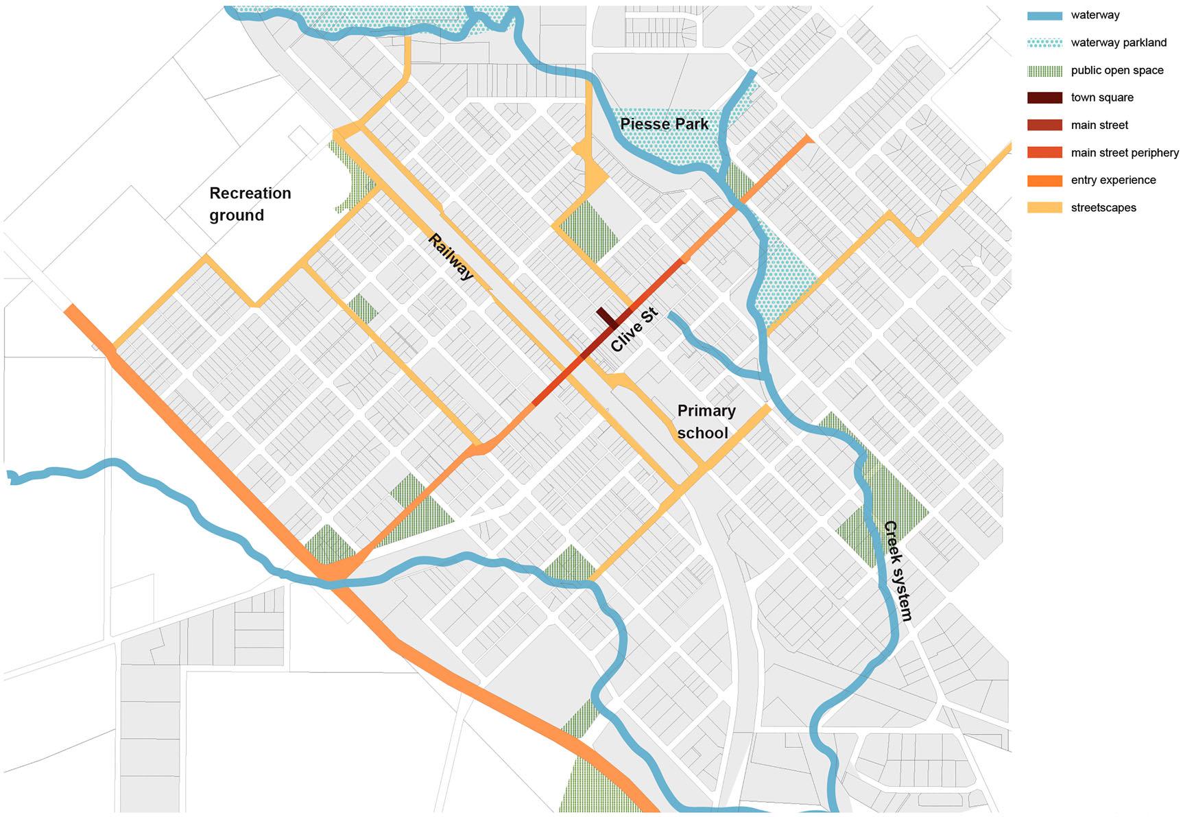 Note:PlannershaveprincipallyusedmainstreetupgradestoincreasetheattractivenessoftheSuperTownsforresidentsandvisitors.This figurefromthe KatanningSuperTownGrowthandImplementationPlanshowsstreetscapestobeupgradedandtheproposedtownsquareonthemainstreet,CliveStreet (drawingcourtesyofEcoscape).