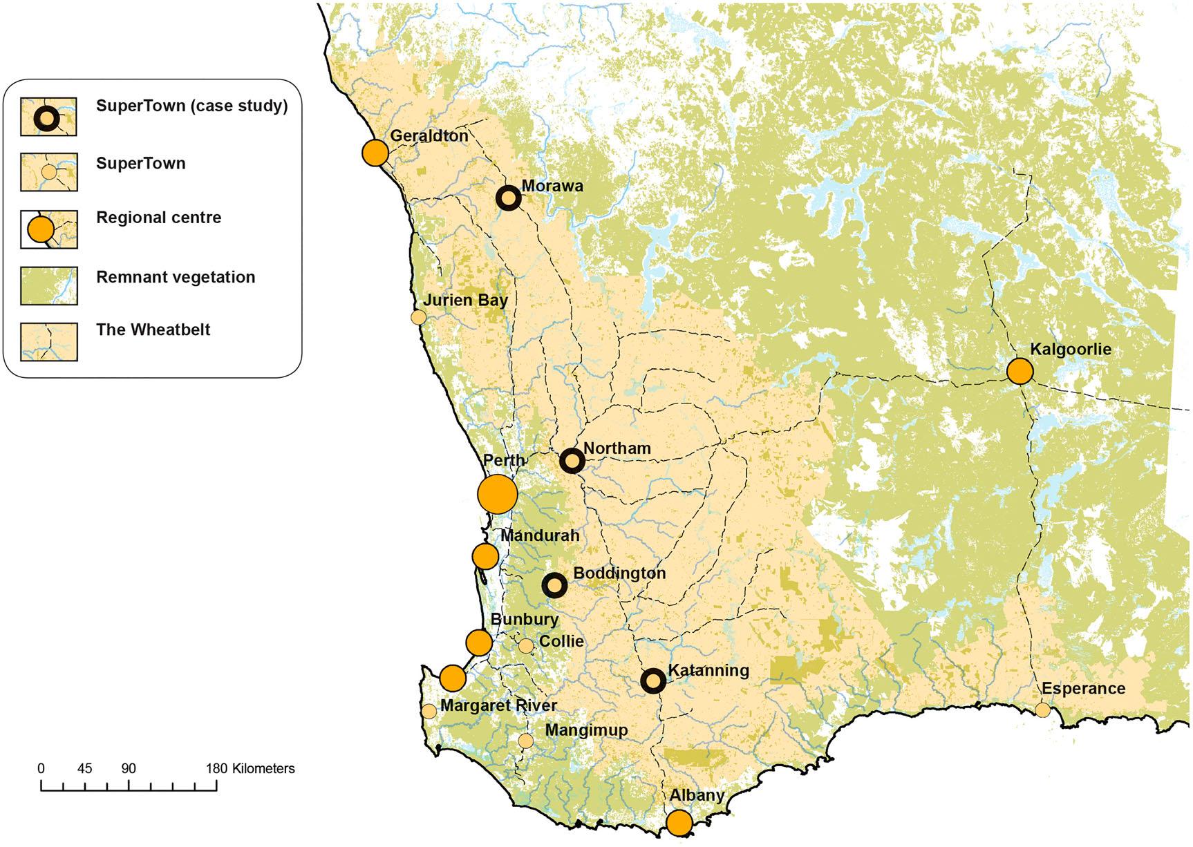 Becauseofthenecessarybrevityofthisresearch paper,IfocusprimarilyontheinlandWheatbelt SuperTownsofMorawa,Northam,Boddingtonand Katanning.ThisisbecausetheseSuperTownsoccur inonegeographicunit(i.e.,theWheatbelt)and becausetheyareinlandtowns.Theother,coastal, SuperTownstypicallyhaveorganicallygrowingpopulations(AlanBurnsandWillis 2011,23),andwhich areexpandingforreasonsotherthanthoseestablished throughSuperTownplanning(Kullmann 2013,243).