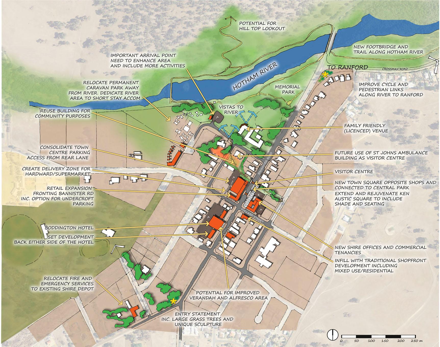 asa ‘transformativeproject,inthatitwillenablemany othernewprojects’ (ShireofMorawa 2012,73).In Boddington,plannersregardedthemainstreet, BannisterRoad,aslackinginvibrancyoraclearly recognisablefocalpoint.Variablebuildingsetbacks andstreetscapetreatments,incombinationwith