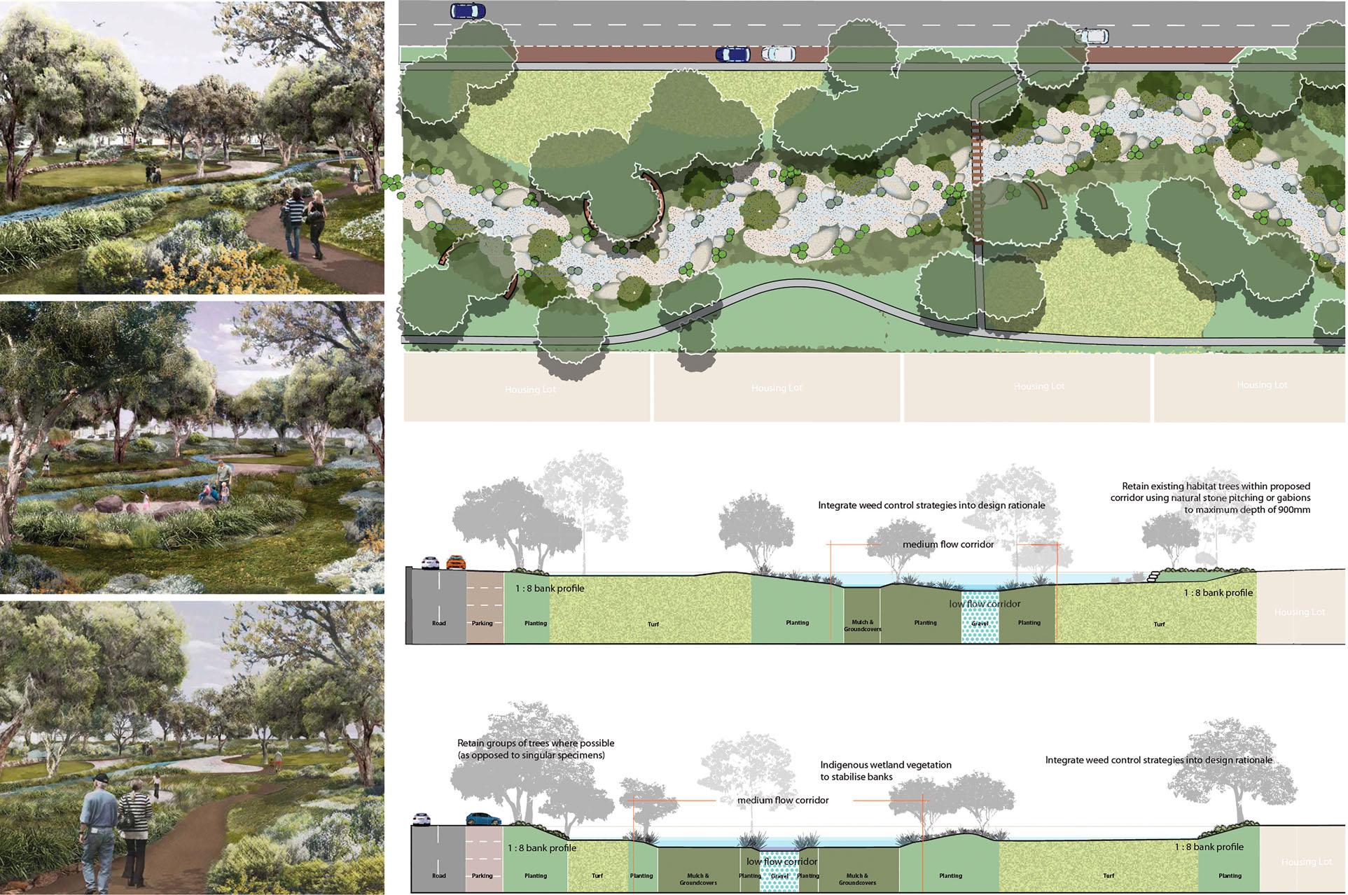 Note:IntheKatanningSuperTownGrowthandImplementationPlanaGreenInfrastructureConnectivityConceptcalledfortherehabilitationofcreekswithin thetownsitewhichareheavilyinfestedwithweedsandmarredbybankstabilisationmeasures,aswellformalisedpedestriantrailsalongthesecorridor (imagecourtesyofEcoscape).