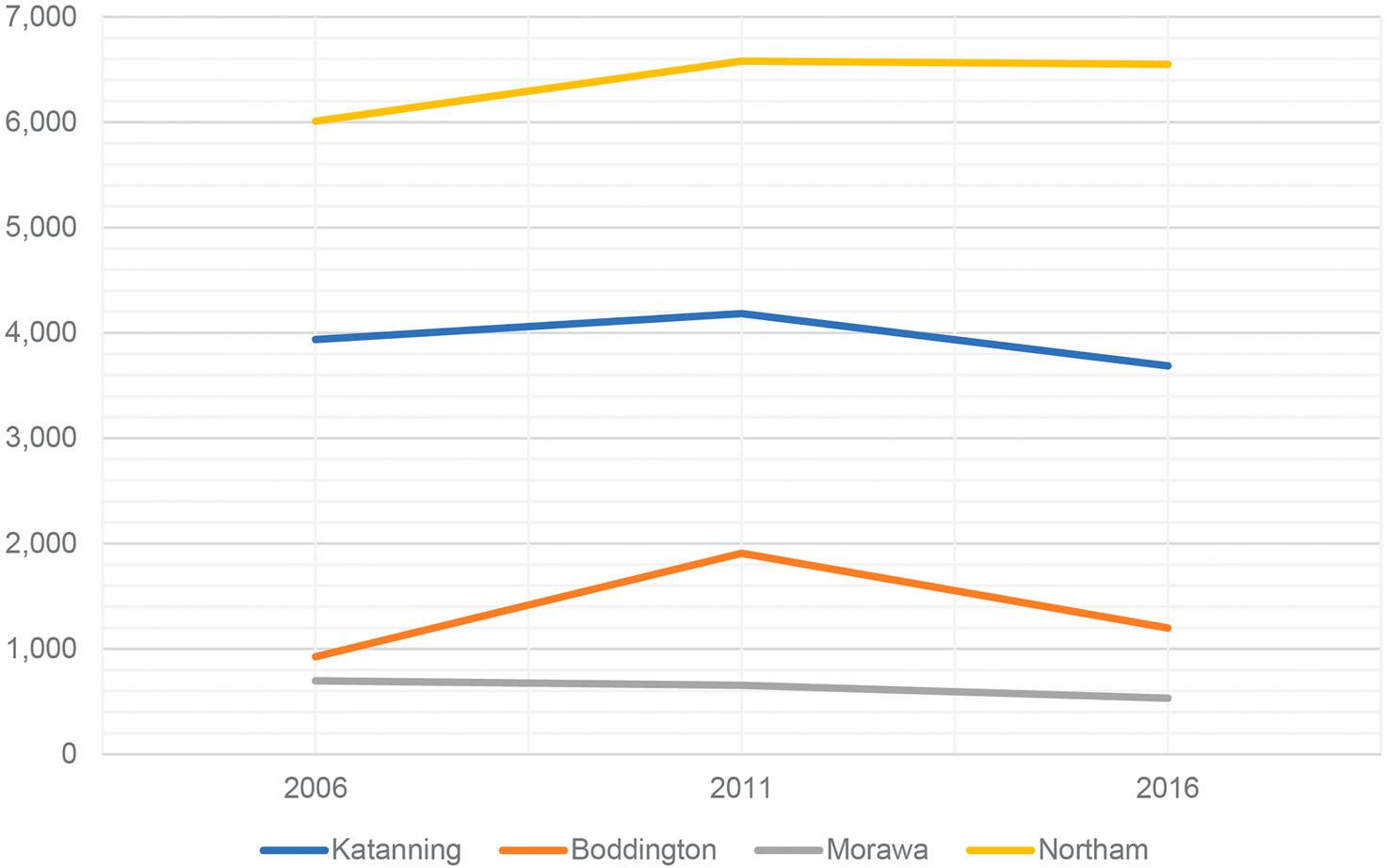 Thissectionexaminesrecentlyreleaseddemographic datatoallowustoformaprovisionalpictureofthe success,orotherwise,oftheSuperTown’spolicyin enablingpopulationdecentralisationawayfrom majorurbancentres.Itisimportanttonoteatthis pointthatthatthesuccessofSuperTownstrategies canbeevaluatedusingcriteriaotherthanpopulation statistics(Kullmann 2013,248),suchasincreased civicpride,orretentionoffamiliesoverlongertime periods.Thesecriteriaarehowevernotpartofthe scopeofthispaper.Concerningpopulationdecentralisation,thepictureismixedatbest.OftheSuperTowns studiedinthispaperallofthepopulationsfell,tovaryingdegrees,whenconsideredattheStateSuburbLevel, themostdetaileddatatheAustralianBureauofStatisticsprovides(AustralianBureauofStatistics 2016) (Figure19).Indetail,Morowa’spopulationfellfrom 655in2011–532in2016(minus123),Northam’ s populationfellfrom6,580–6,548(minus32),Boddington’sfrom1,908–1,198(minus710)andKatanning’ s populationfellfrom4,183–3,687(minus496).In total,thecasestudySuperTown’slost1,361peoplein