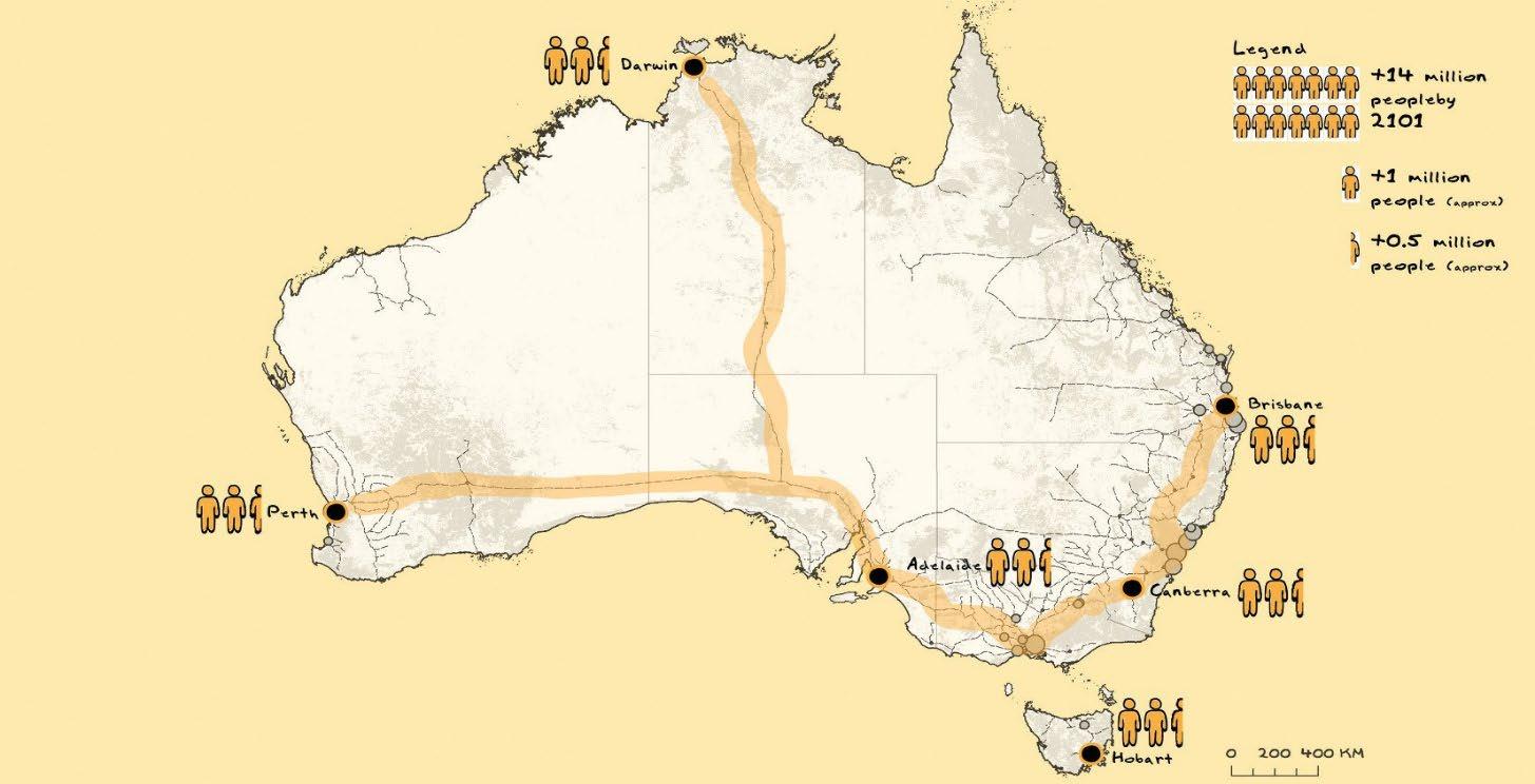 Melbourne and Sydney, Australia’s two biggest cities, generate a substantial portion of Australia’s gross domestic product and historically have attracted most migrants (Kelly and Donegan 2015). This “status quo” scenario extrapolated this situation and hypothesised that by 2101, Melbourne and Sydney increase by almost 7 million people each (Figure 9).