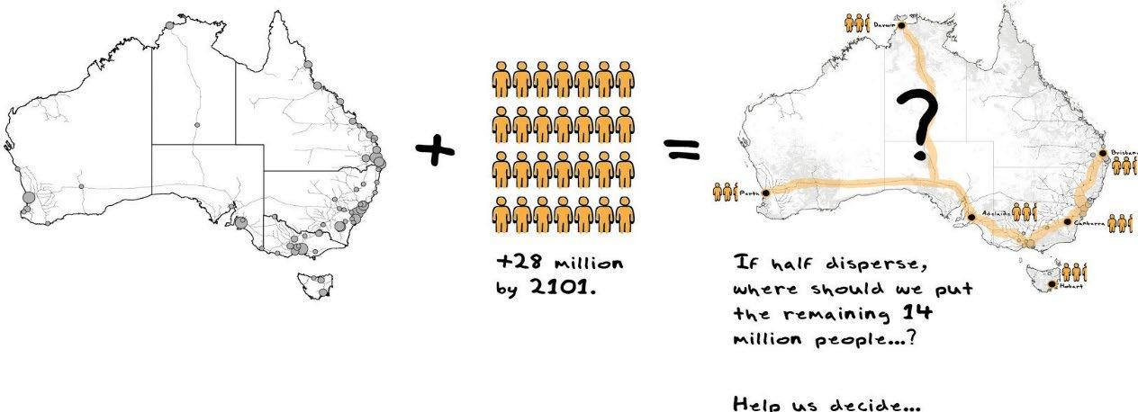 The national population forecast for 2101 employed in the survey was the Australian Bureau of Statistics’ mid-range (Series B) projection of 53 million (Australian Bureau of Statistics 2013). This projection reflects a 28 million person increase on the current national population. An assumption was made that half of this increase would disperse across existing Australian cities and towns. As such, the important question was where respondents would support another 14 million Australians residing (Figure 2).