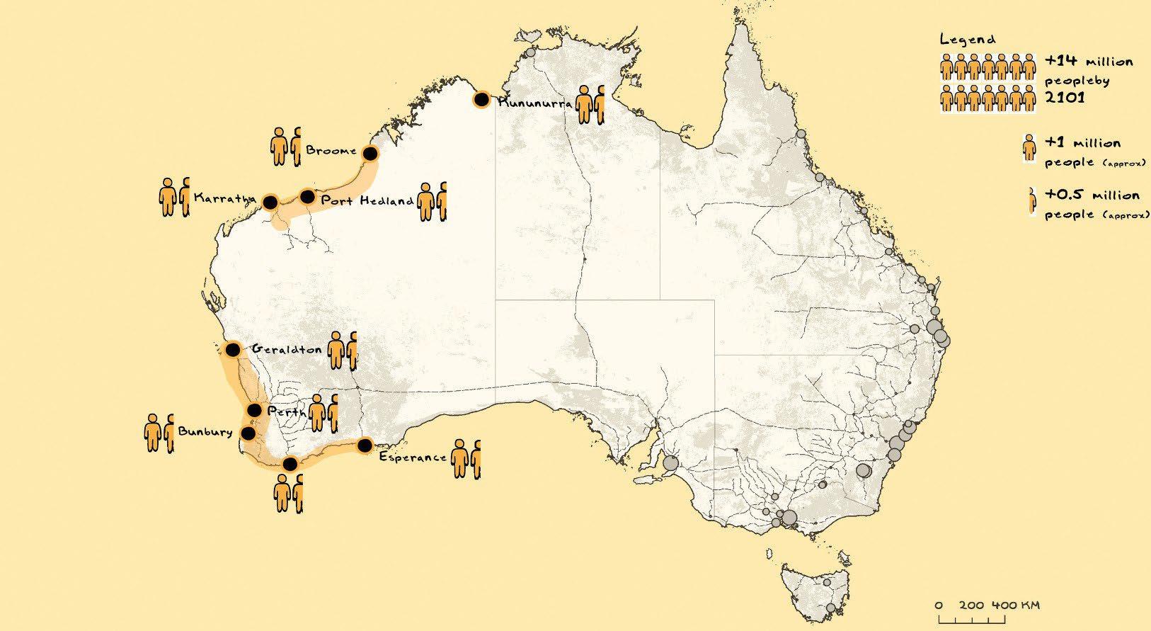 Western Australia comprises one-third of the Australia continent but houses only 11% of its population. In response, this scenario boosted cities and towns along the west coast by over 1.5 million people (Figure 10). It builds upon the current Western Australian Royalties for Regions programme (Western Australian Planning Commission 2014) and planning for the state’s capital city, Perth (Department of Planning Lands and Heritage 2018).
