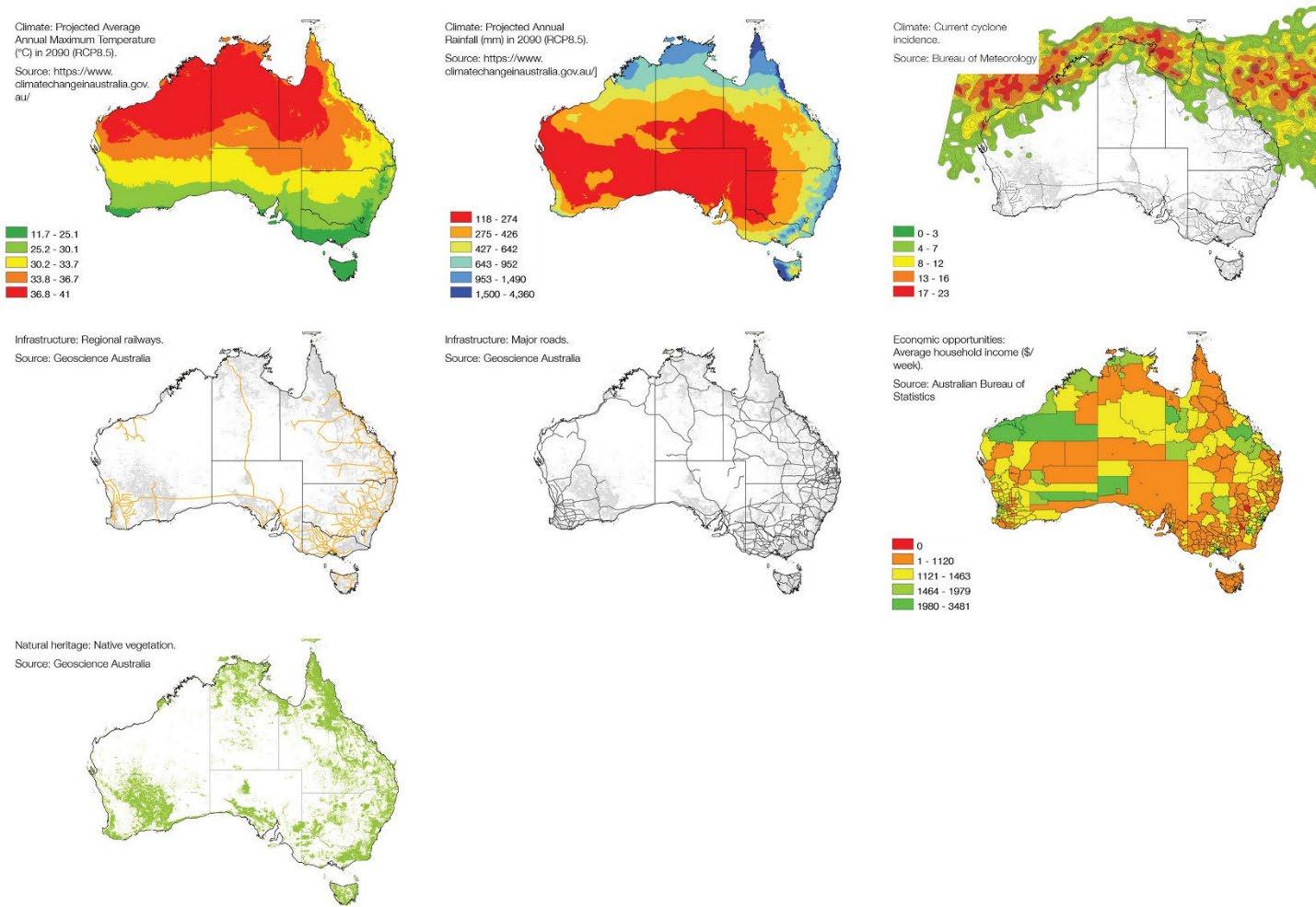 Prior to preferential judgements being asked, the survey displayed national-scale mapping to provide a base level of knowledge in four areas. Under the “climate” theme, mapping of the projected (2090) average annual maximum temperature and annual rainfall was presented (Australian Government 2017) (Figure 1). The meteorological data were derived from the Intergovernmental Panel on Climate Change (IPCC) Representative Concentration Pathway 8.5 climate projection (Intergovernmental Panel on Climate Change 2014) and the ACCESS1.0 model developed through collaboration between the Bureau of Meteorology and CSIRO (Australian Government 2017). Additionally, areas showing cyclone incidence were shown (Bureau of Meteorology 2020). Mapping of other categories was more straightforward. Maps of existing