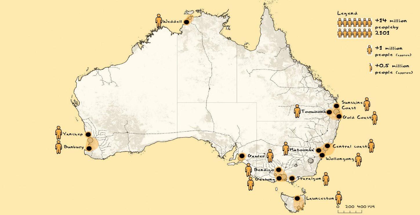 In response to congestion and affordability challenges in the state capital cities (Kelly and Donegan 2015), this scenario conformed to an enduring planning model of metropolitan population redistribution (Freestone 1982), suggesting the distribution of population growth to 14 satellite cities (with some illustrative locations only suggested). Within commuting distance of state capital cities, these satellites increase by over 1 million people by 2101 (Figure 4). This scenario broadly aligns with Federal Government planning for “population, migration and better cities”, which designated several satellite centres for growth (Australian Government, 2019b) and relates to a scenario recently proposed by the Regional Australia Institute (Vij et al. 2019).