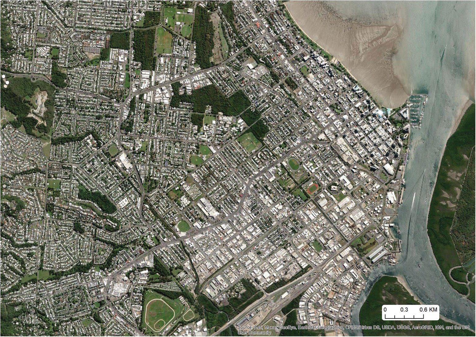 Figure 4 Cairns city centre and surrounding suburbs (total population 140,000). Map by the authors with data from Esri, Maxar, GeoEye, Earthstar Geographics, CNES/ Airbus DS, USDA, AeroGRID, IGN and the GIS User Community.