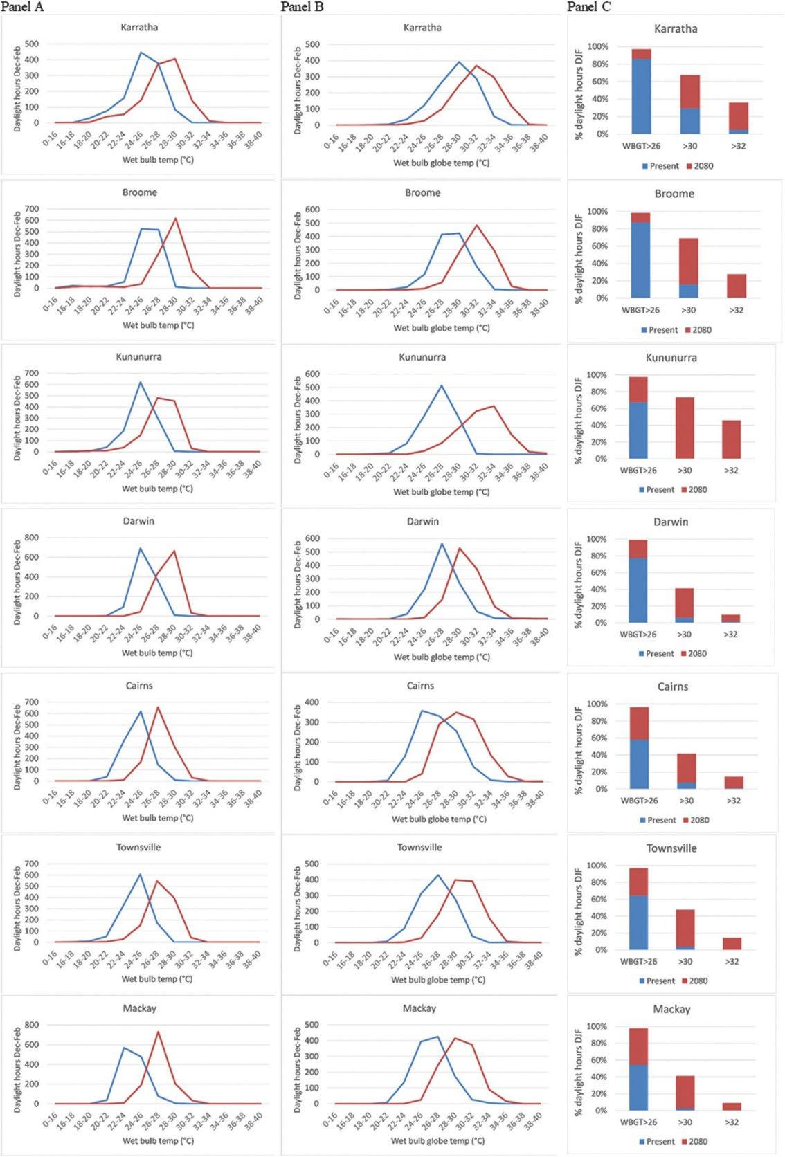 Figure 7 Panel A – Present and 2080 distribution of WBTs in the hours of 7am-7pm in the months December to February; Panel B – Present and 2080 distribution of WBGTs in the hours of 7am-7pm in the months December to February; and Panel C – Present and 2080 exceedance of threshold WBGT in the hours of 7am-7pm in the months December to February.