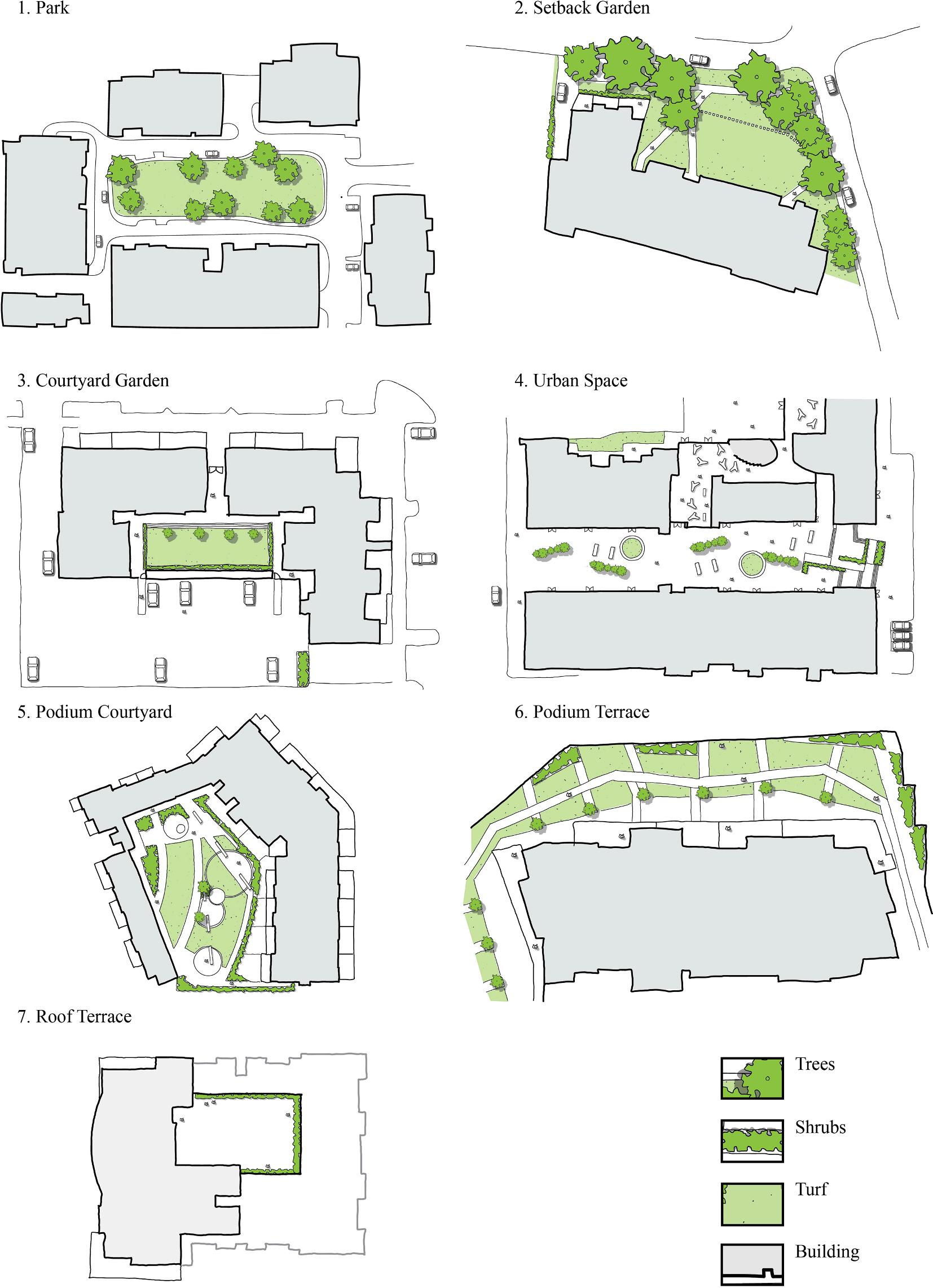 Seven unique COS types were identified: (1) Park, (2) Setback Garden, (3) Courtyard Garden, (4) Urban Space, (5) Podium Courtyard, (6) Podium Terrace, (7) Roof Terrace (Fig. 1) (Table 2).