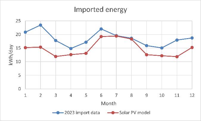 No direct information is available for this house, which is depicted in Figure 28. The Western Power data for the suburb of St James includes electricity imported from the SWIS and exported from rooftop solar. Using a separate in-house solar PV and battery model, the amount of self-supply and hence total electricity demand for an average dwelling was calculated for the year 2023 (Figure 29).