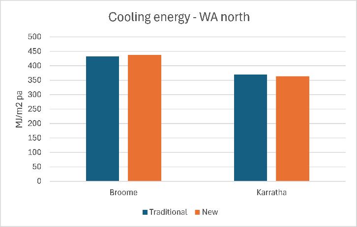 Cooling loads in the south of the state are less than half that in Broome and Karratha on a per m2 basis, but exhibit no significant differences between traditional and new houses. The results broadly reflect latitude, but with the coastal influence observable in Geraldton and Perth.