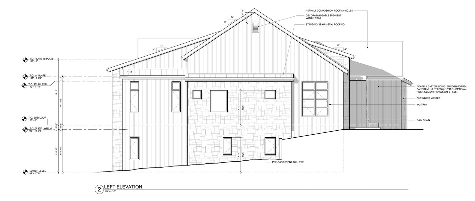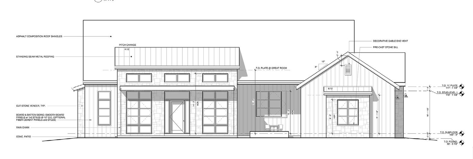Materials used for Putnam Farmhouse were board and batten siding, stone veneer, asphalt shingles and standing seam metal roofing.
