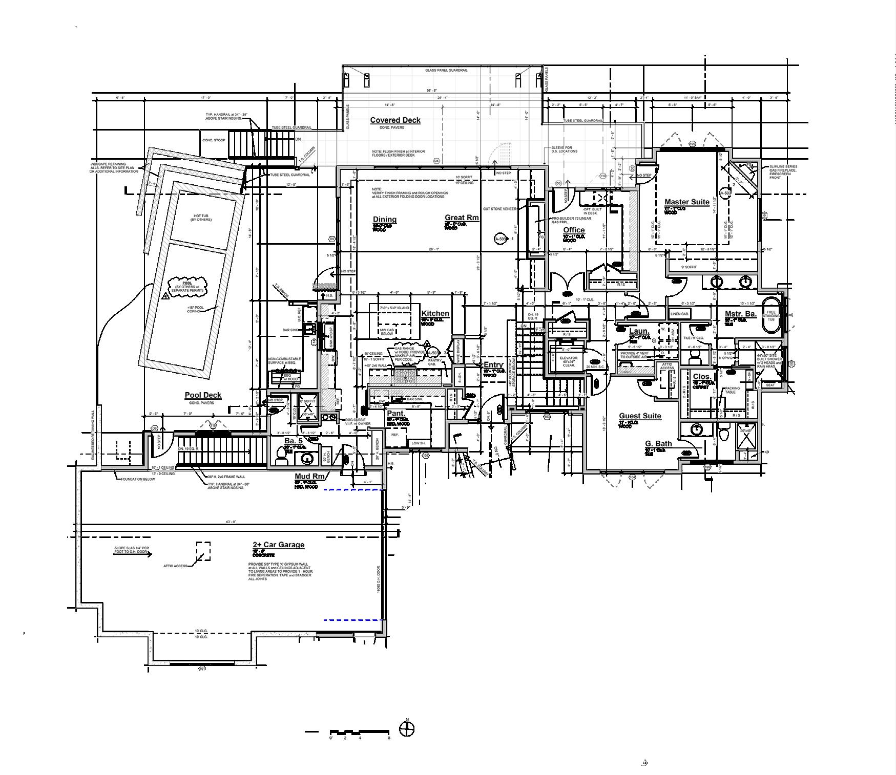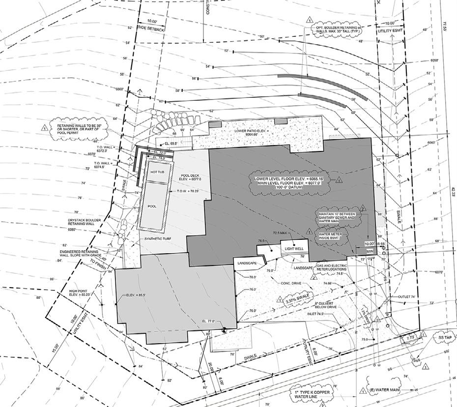 This home has 4 bedrooms, a large open kitchen design, offices, living spaces, and is equipped with a pool and a home shop in the basement. This home is sloped into the topography of the landscape and has two large covered patio areas. This a beautiful home and in this section you will find site plans, floor plans,