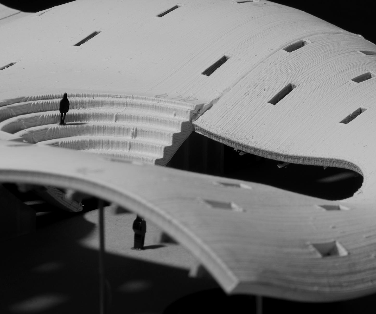 The 9,200 sq. ft market, a community gathering space, provides a year-round focal point and a symbolic living room for the city. I designed this project while attending CU Boulder. Located in the heart of downtown Boulder, the complex touches upon the primal notions of gathering, creating a venue for passive and active use and recreation. The large roof overhang provides protection from rain and sun. The undulating roof lifts up from the building to gesture towards the park and adjacent thoroughfare, with the gap between the building and roof becoming a dramatic clerestory. The roof then drops down towards the plaza to provide a sense of enclosure and safety. The structure dissolves into an open floor plan to host the local farmer’s market and other large scale events.
