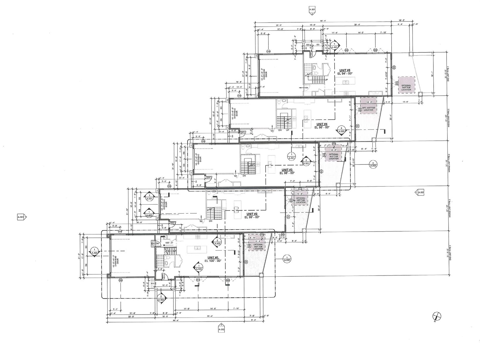 This is the main level floor plan for “Building K”. The units vary from 3-4 bedroom with 3.5 baths. They all are three story units with a garage on the front. The condos are built into the topography to allow the front entrance from the second story, and the back exit from the bottom floor.