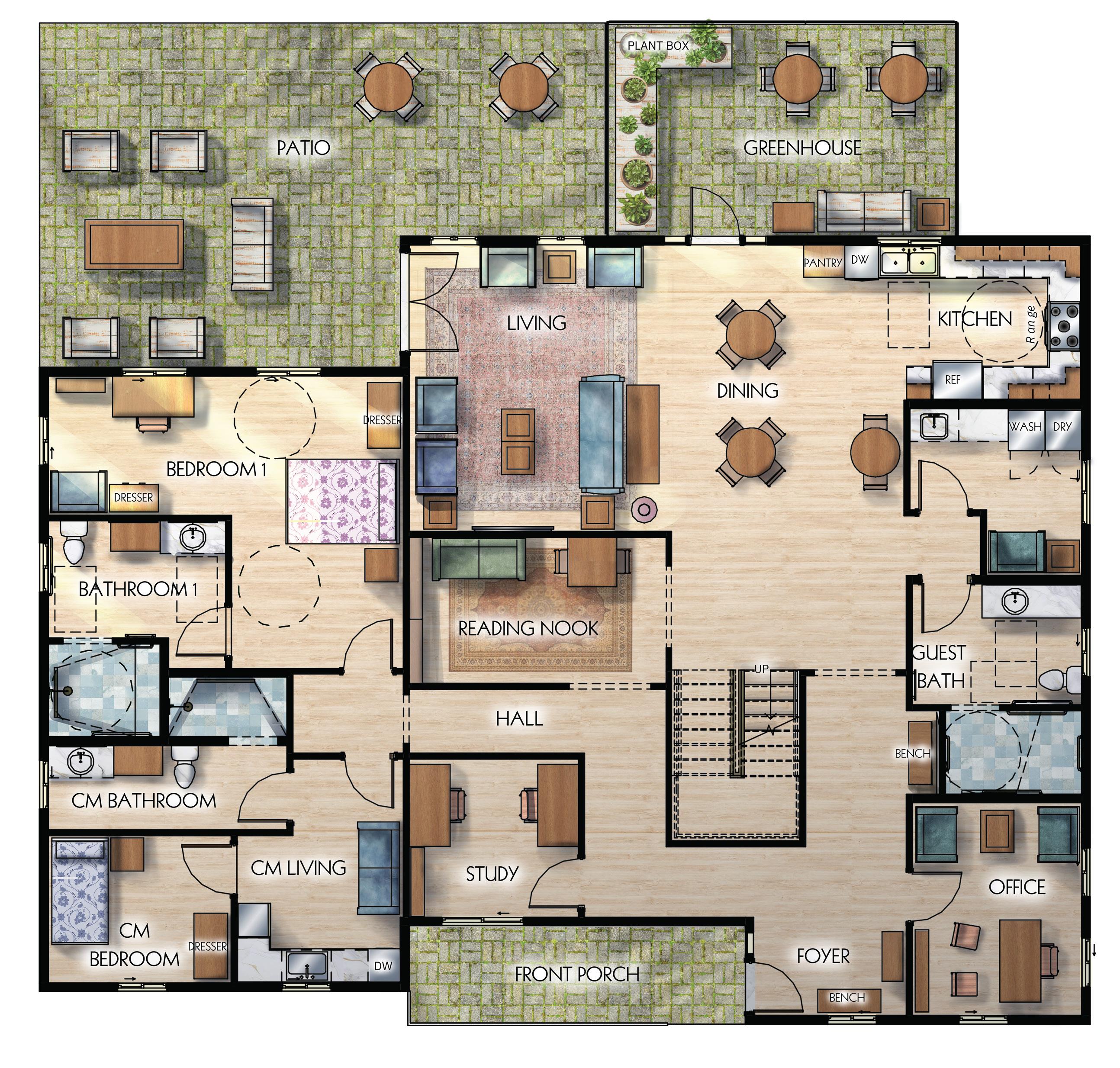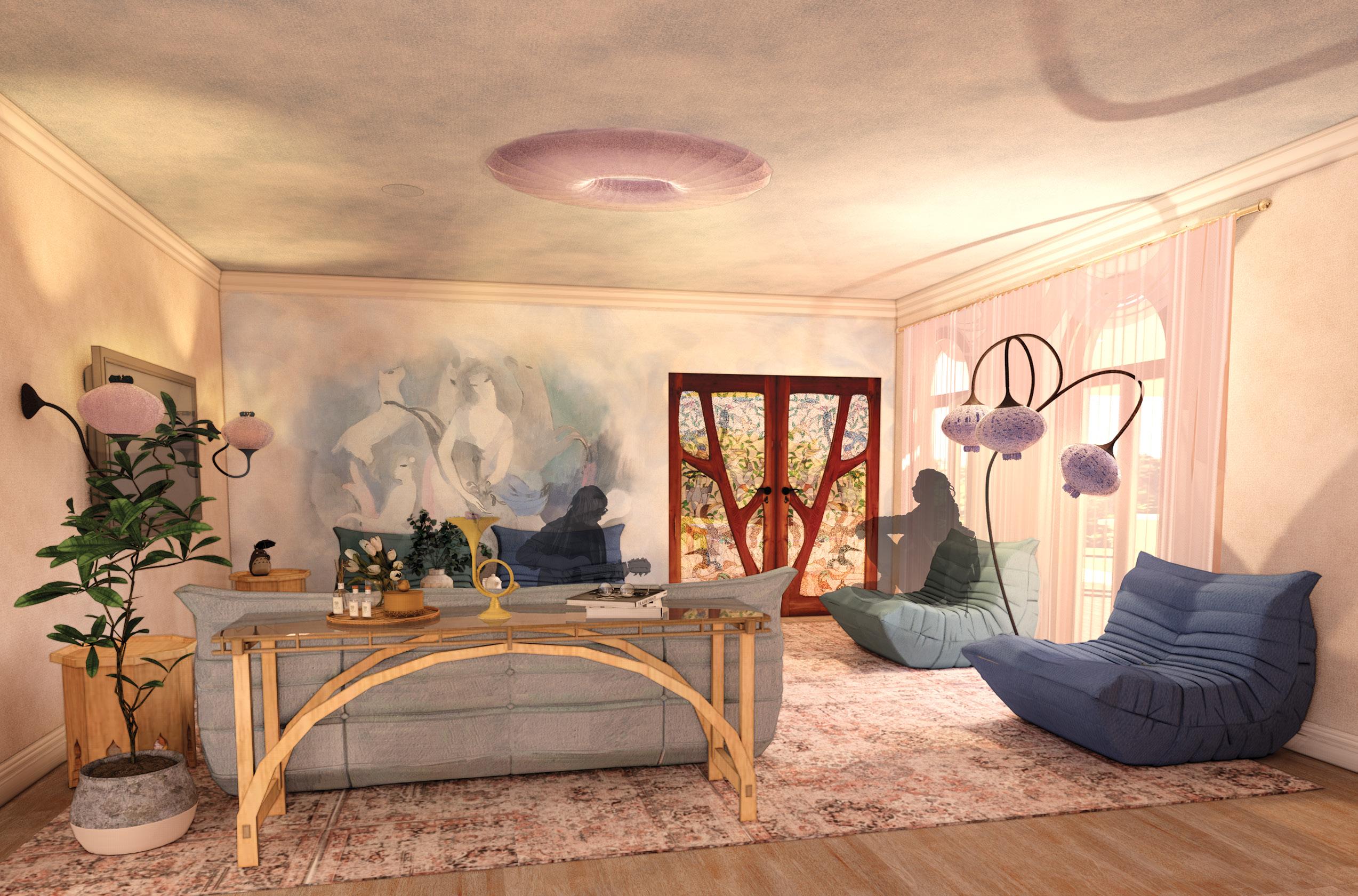 As a haven for survivors of domestic violence and trafficking, the Youth Center will be their home in every sense of the word-- one that carries an emotional connection and a sense of safety, privacy, and belonging. The film, My Neighbor Totoro, by Hayao Miyazaki tells the story of how two girls cope in the midst of moving into a new home as their mother lies ill in the hospital. Their playful imaginings of friendly spirits as they explore the forest exemplify the healing realization that joy and “home” can be found anywhere. The space will reflect the whimsical nature of the plot with an eclectic blend of patterns, textured window treatments, murals, and decorative accessories. The calming color palette of dusky blues and faded oranges will mirror the zen movie scenes. As Totoro progresses, nature is recognized as offering physical and psychological healing as the sisters adjust to their new home. In the same way, potted plants within the interior, furniture directly inspired by nature, an abundance of natural daylight, and windows overlooking the views outside will embellish the space. An open layout with clear sightlines, flexible furniture, and intuitive circulation will give a sense of visual security and expansiveness similar to the great outdoors. In the film, the great camphor tree is the sacred home of the forest spirits-- its branches tower over the sisters’ home to create a protective canopy. Likewise, the Youth Center will not only have safe, enclosed private spaces but public spaces that prioritize security. Through Totoro’s overall message about the power of imagination and the necessity of hope in difficult times, the design of the Youth Center will in turn encourage users to discover their inner child.