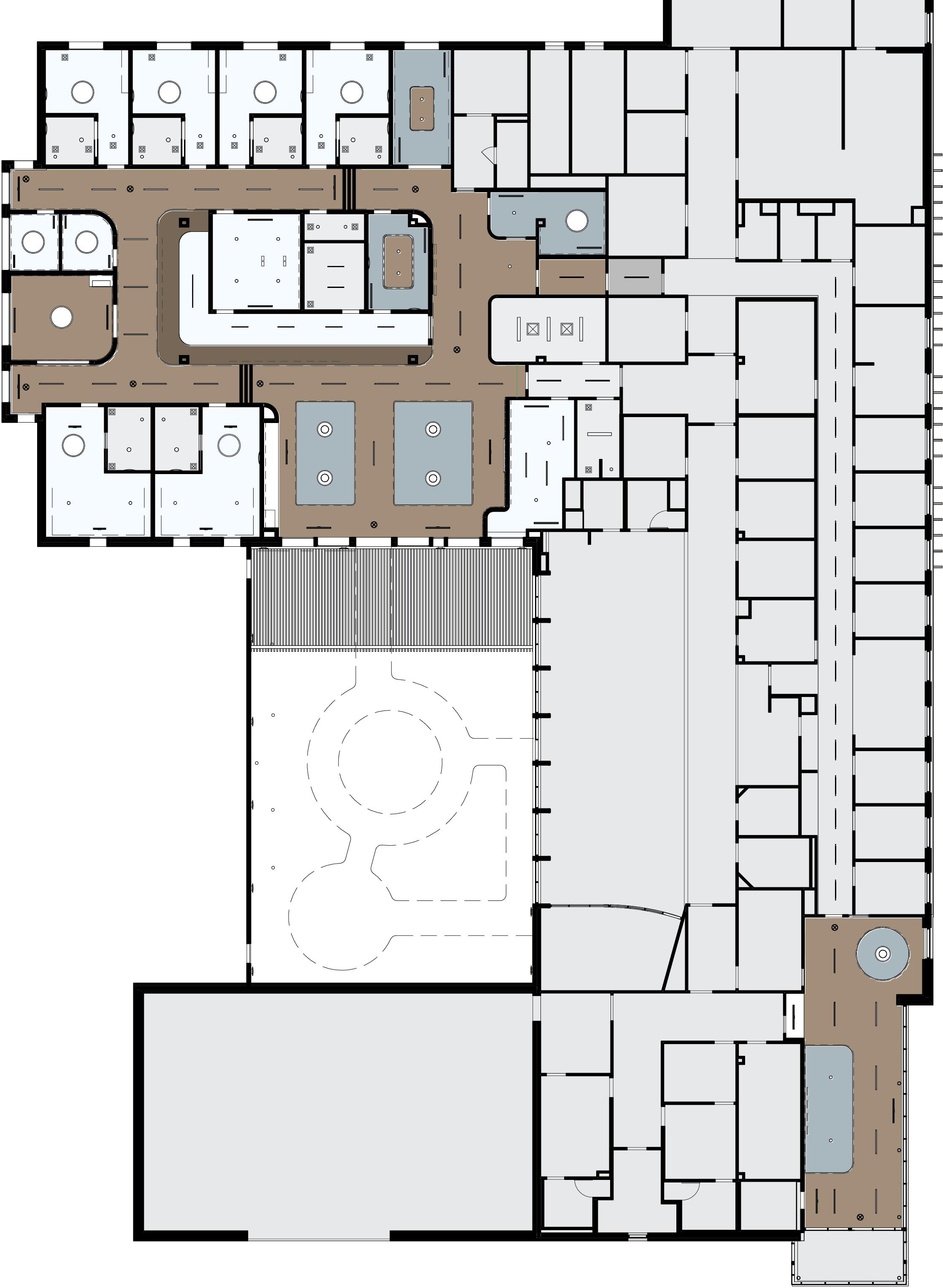To harness nature’s healing potential, dynamic outdoor spaces will include multi-functional areas such as open spaces for activities, seating for relaxation, and garden planters for hands-on engagement. These elements mirror the diversity of nature, offering a rich sensory experience that enhances well-being for all users.