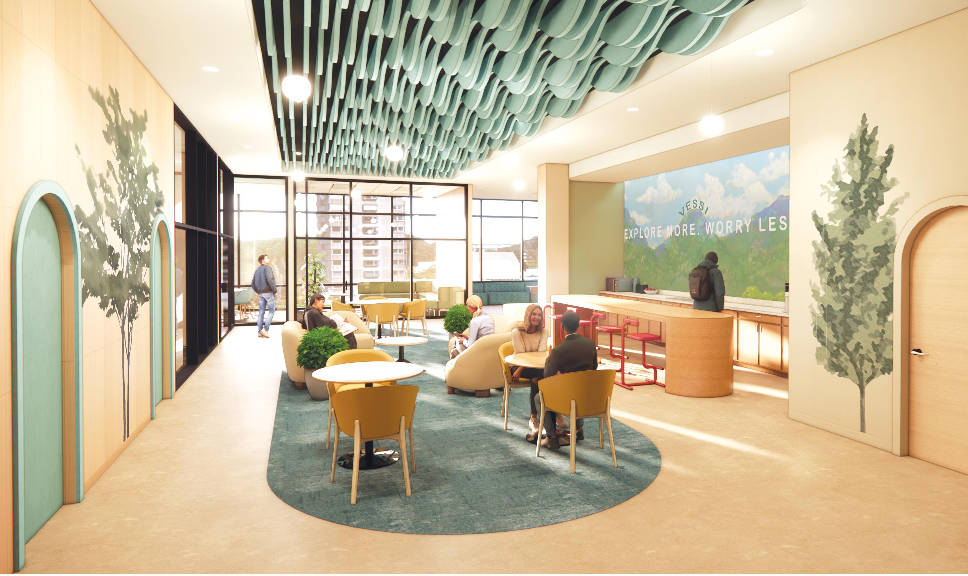 The work cafe serves as the vibrant center for social interaction Its thoughtfully arranged furniture fosters spontaneous conversations and connections, while a soothing color palette cultivates a rejuvenating and inviting ambiance.
