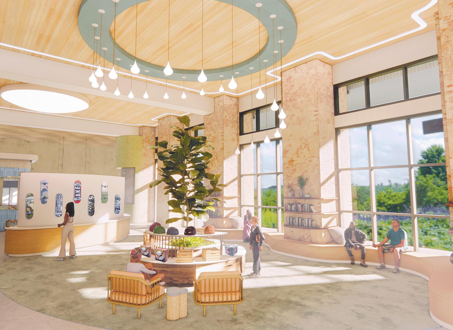 The milieu space offers a direct visual and physical connection to a secure outdoor environment, promoting relaxation and a sense of openness. The space is designed for socialization with usages of bold oranges and sociopetal furniture arrangements.