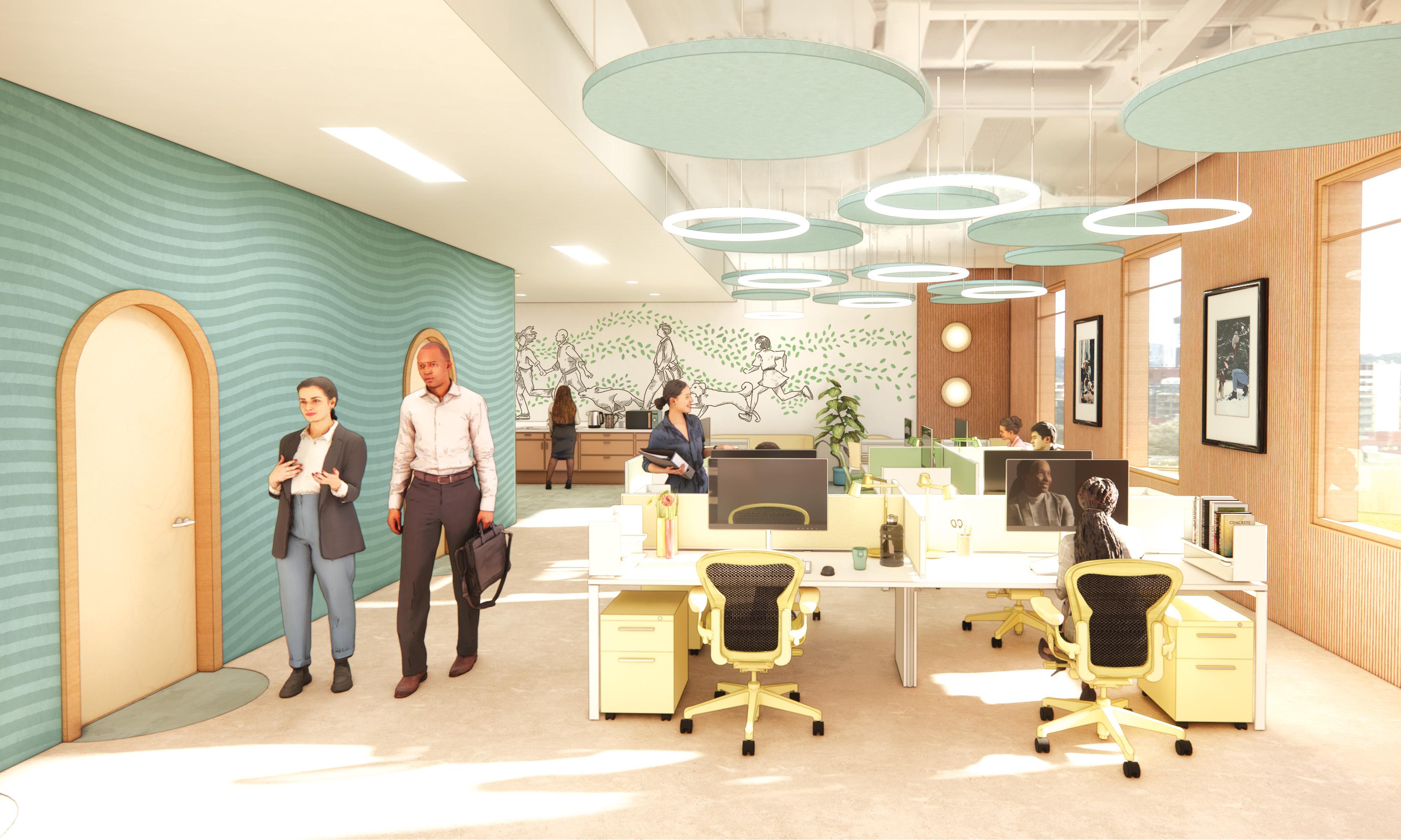 The workstations are color-coded according to department, streamlining identification and fostering efficiency within the workspace. Acoustical features have been thoughtfully integrated to promote a focused and productive environment Additionally, a bespoke wall art installation adorning the coffee bar wall provides a refreshing and visually stimulating focal point, offering users a source of inspiration amidst their workday.