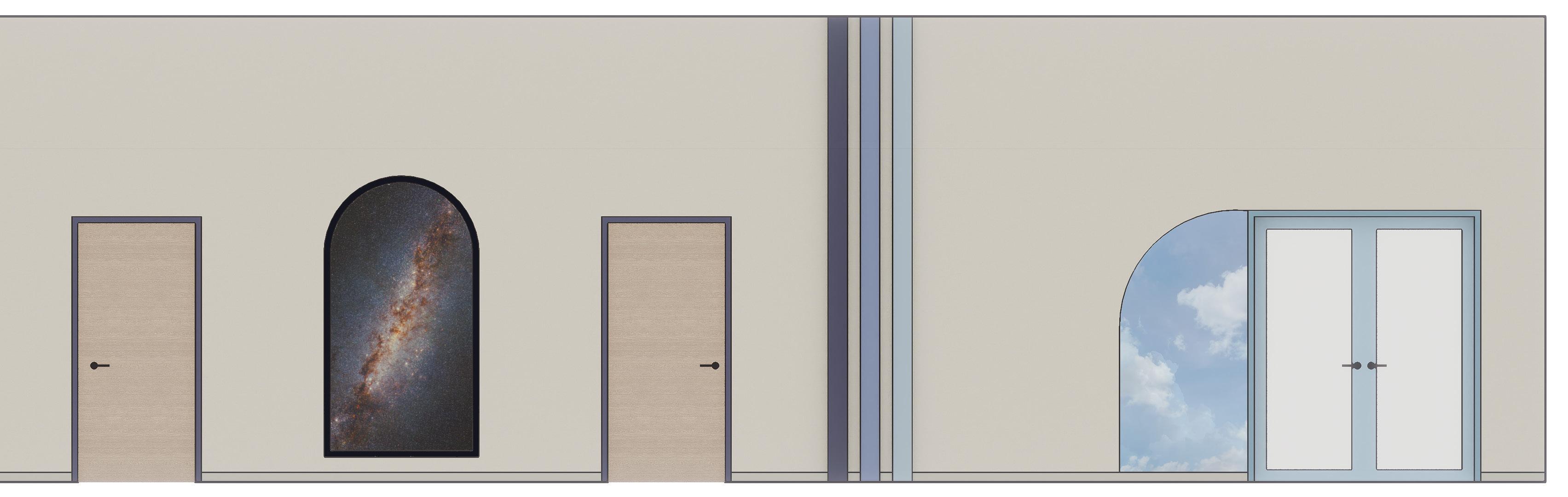 The space is carefully designed with open sight lines, enabling occupants to effortlessly assess their surroundings. Expansive windows adorn the area with natural light, offering captivating views of the outdoors and connecting inhabitants with the surrounding environment. Multiple lighting options, including wall sconces, floor lamps, and overhead fixtures, afford occupants the freedom to adjust the lighting levels to their preferences. Versatile and adaptable furniture arrangements empower occupants to tailor the space to their needs. The space’s aesthetic appeal is enhanced by the inclusion of organic light fixtures, a stunning stained glass door, soothing mural, a calming color palette, and biophilic elements, harmoniously blending the indoors with the natural world.