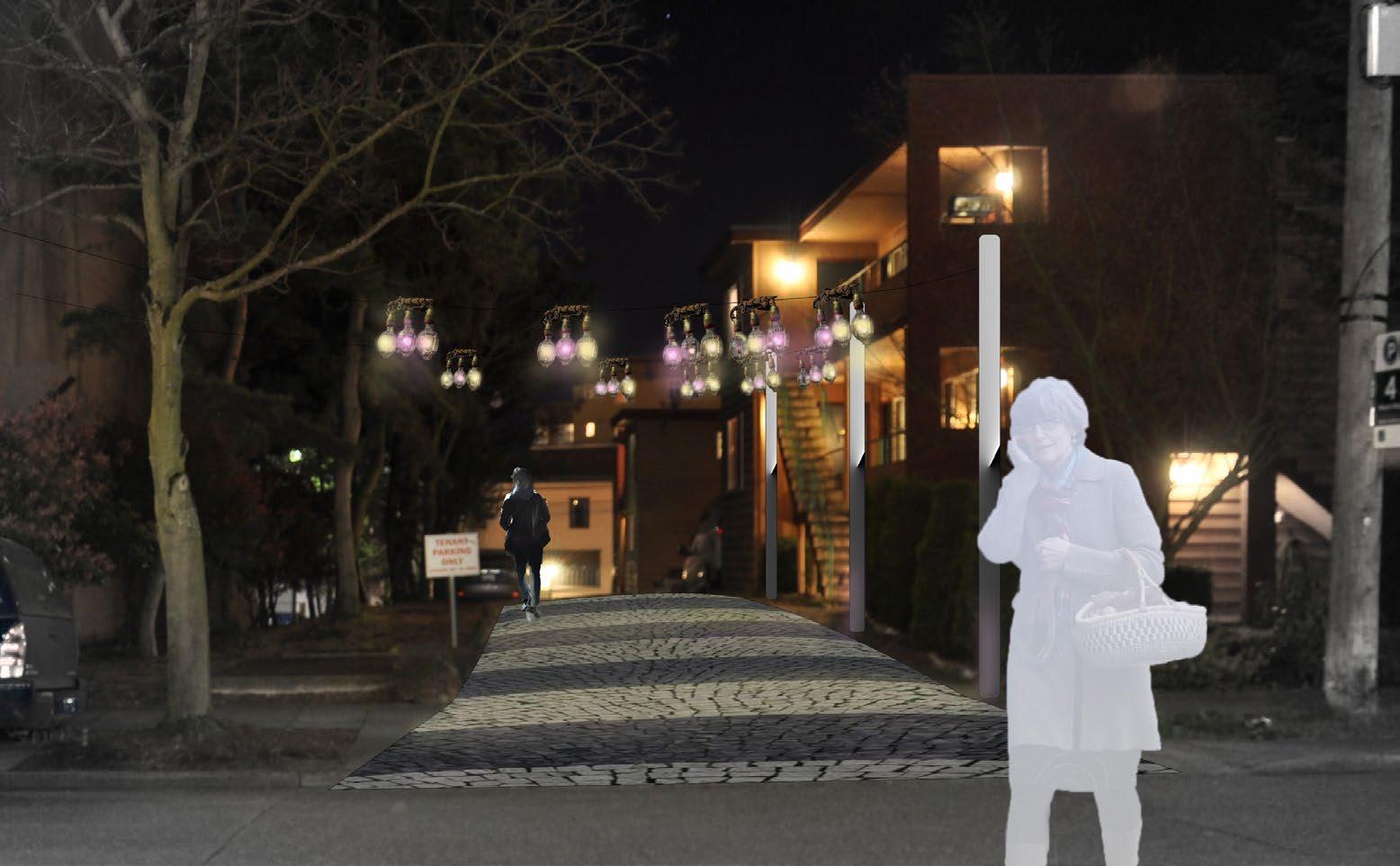 with low light and visibility levels and an unimproved road surface (footing) has been made safer and more attractive by creating a canopy of lights inspired by the form of squid fishing lamps (string of lights) and by marking the space as one that is maintained and navigable with a