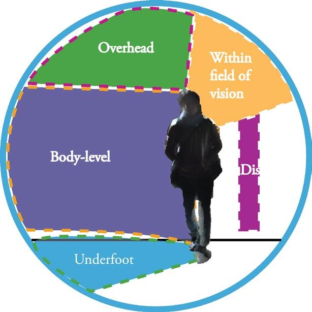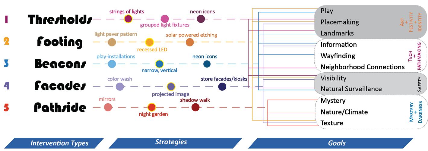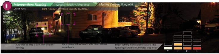 The body zone represents the spatial relationship of the pedestrian figure to lighting (and other) interventions made at night. Will interventions be primarily aimed to be perceived as immersive, distant, adjacent to one’s body? Heights and proximity affect the intensity and effect of lights, and being able to sort lighting into human-scaled positioning will assist in predicting and determining the interaction with a given piece.