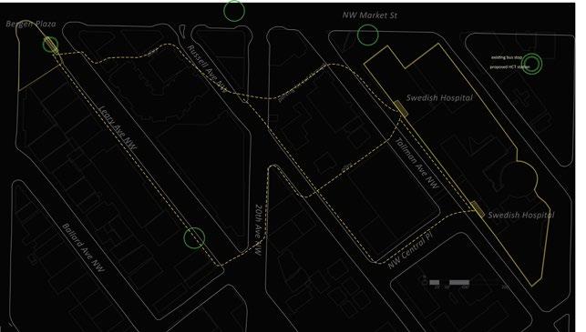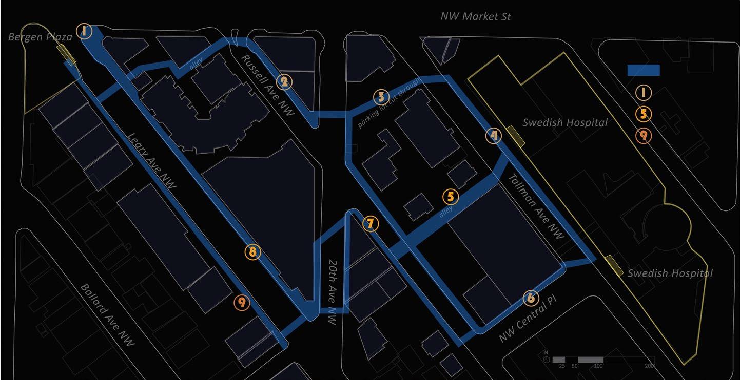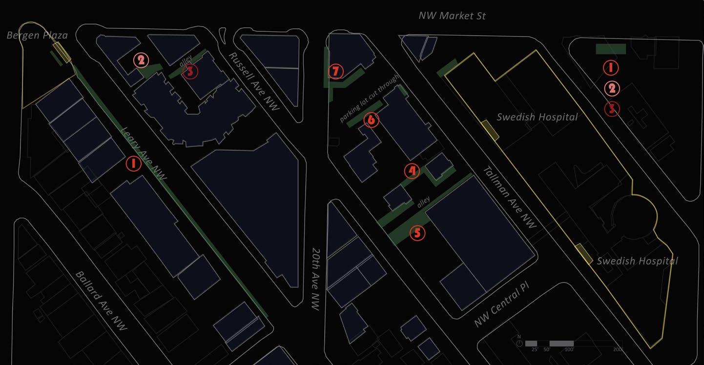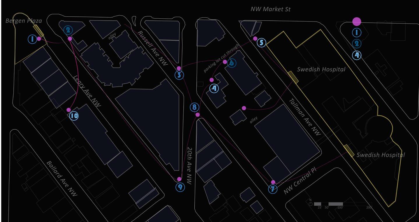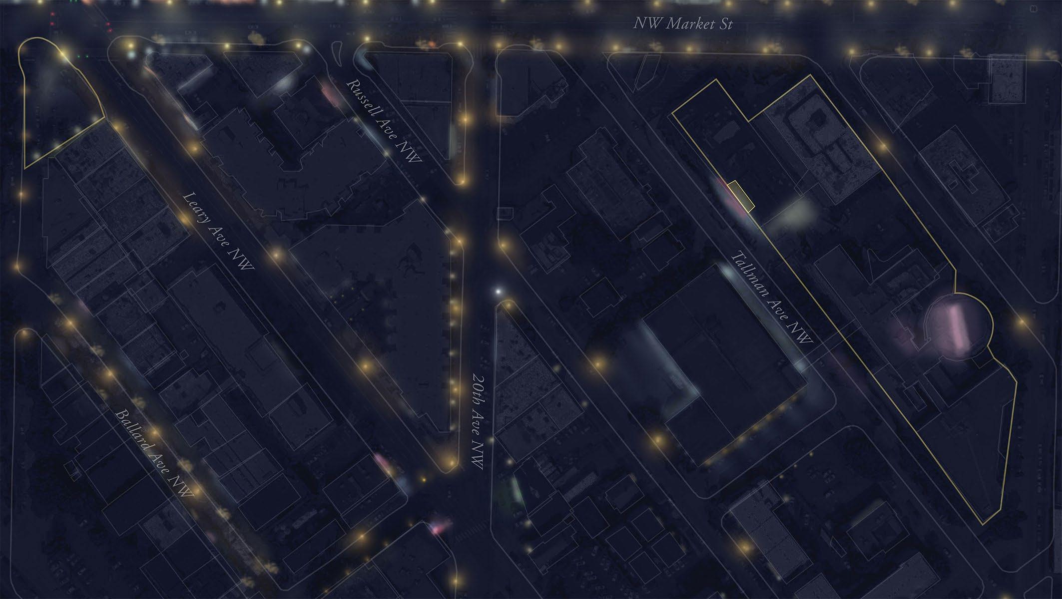 The Lan[d]tern site is a subdistrict of Ballard, Seattle, adjacent to the historic and nightlife district that runs along Ballard Avenue. The study takes as its starting point the intersection of Market and Leary, which is a busy, welllit and pedestrianized intersection that could in the future see the addition of a high-capacity transit line, such as a streetcar or underground light rail. The study observes the potential for multiple routes that would connecting a hypothetical station at this intersection to Swedish Hospital a quarter mile away. The hospital is an important source of employment in the area and has a need for good evening access for its night shift workers and guests.
