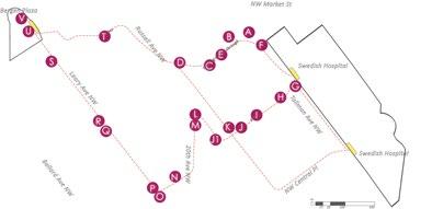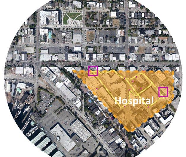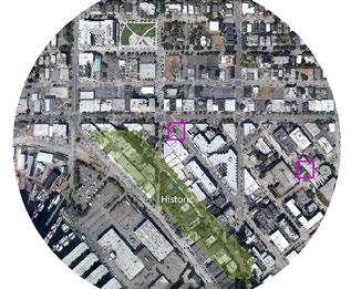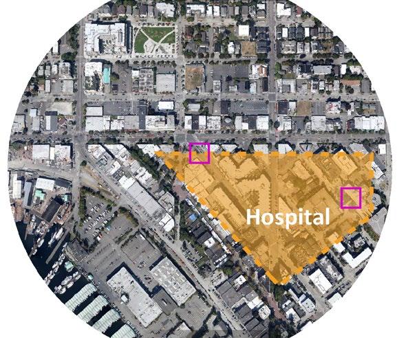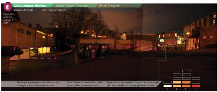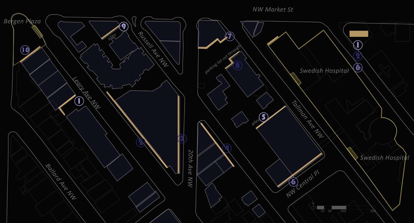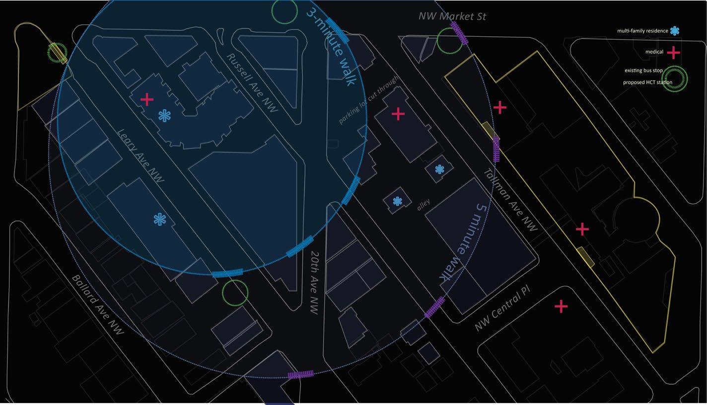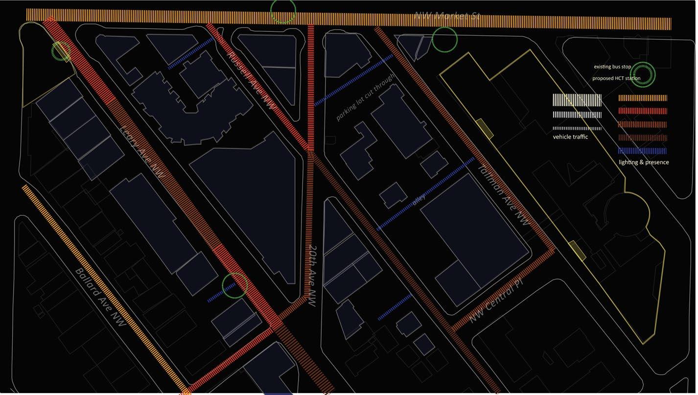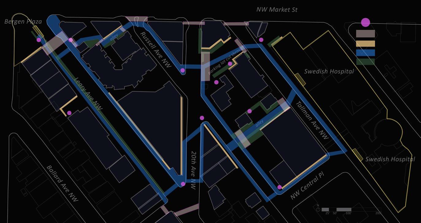 The Lan[d]tern site is a subdistrict of Ballard, Seattle, adjacent to the historic and nightlife district that runs along Ballard Avenue. The study takes as its starting point the intersection of Market and Leary, which is a busy, welllit and pedestrianized intersection that could in the future see the addition of a high-capacity transit line, such as a streetcar or underground light rail. The study observes the potential for multiple routes that would connecting a hypothetical station at this intersection to Swedish Hospital a quarter mile away. The hospital is an important source of employment in the area and has a need for good evening access for its night shift workers and guests.