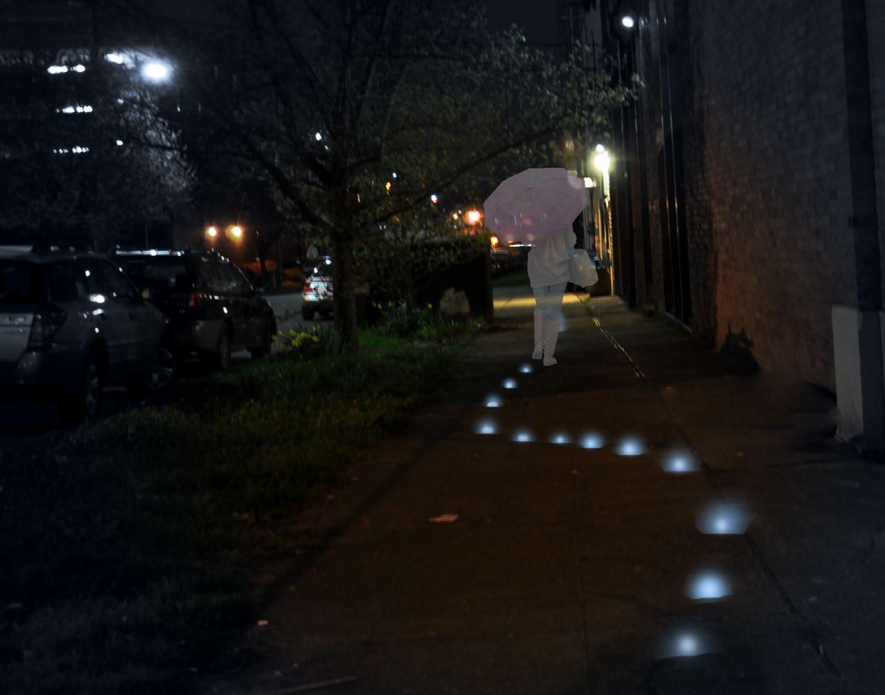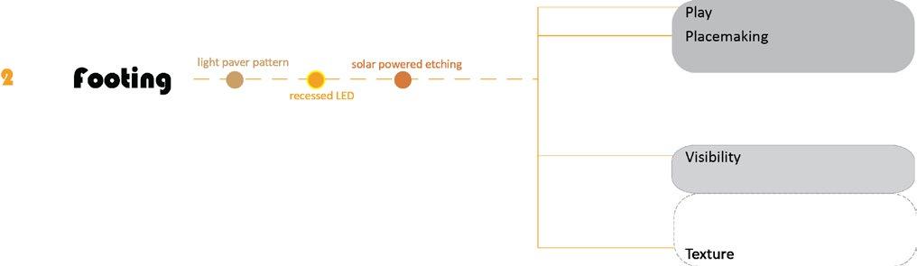 Body Zone: Underfoot Light Intensity: Low Structure: Ground – sidewalk, asphalt, dirt, pavers, pavement Aspects: Safety, Texture Goals met: Route is defined, Visibility for footing is improved, light levels are kept low, mixture of low-tech and interactive design Features: LED technology, movement-responsive design, textural materials, repeatable patterns, ecologically friendly