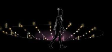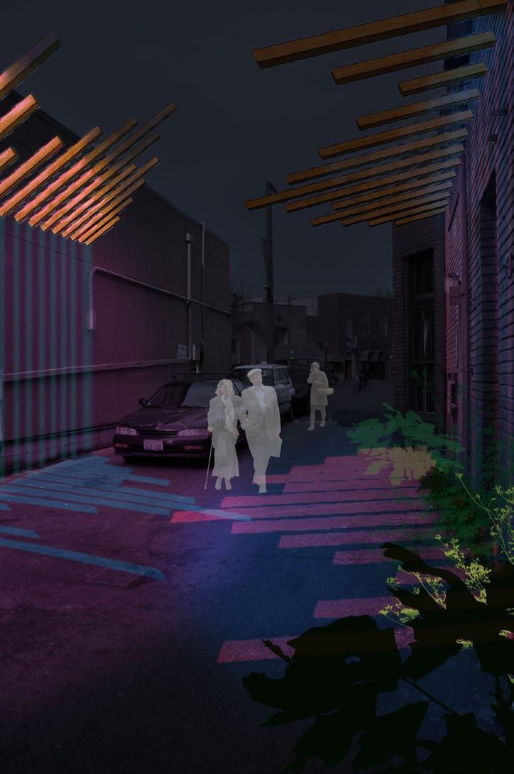 Body Zone: Distance, Body Level Light Intensity: Moderately High Structure: Metal, neon, LED Aspects: Safety, Texture Goals met: Route is defined for users, Visibility is improved while keeping light levels low, mixture of low-tech and interactive design Features: LED technology, movement-responsive design, textural materials, efficient energy usage