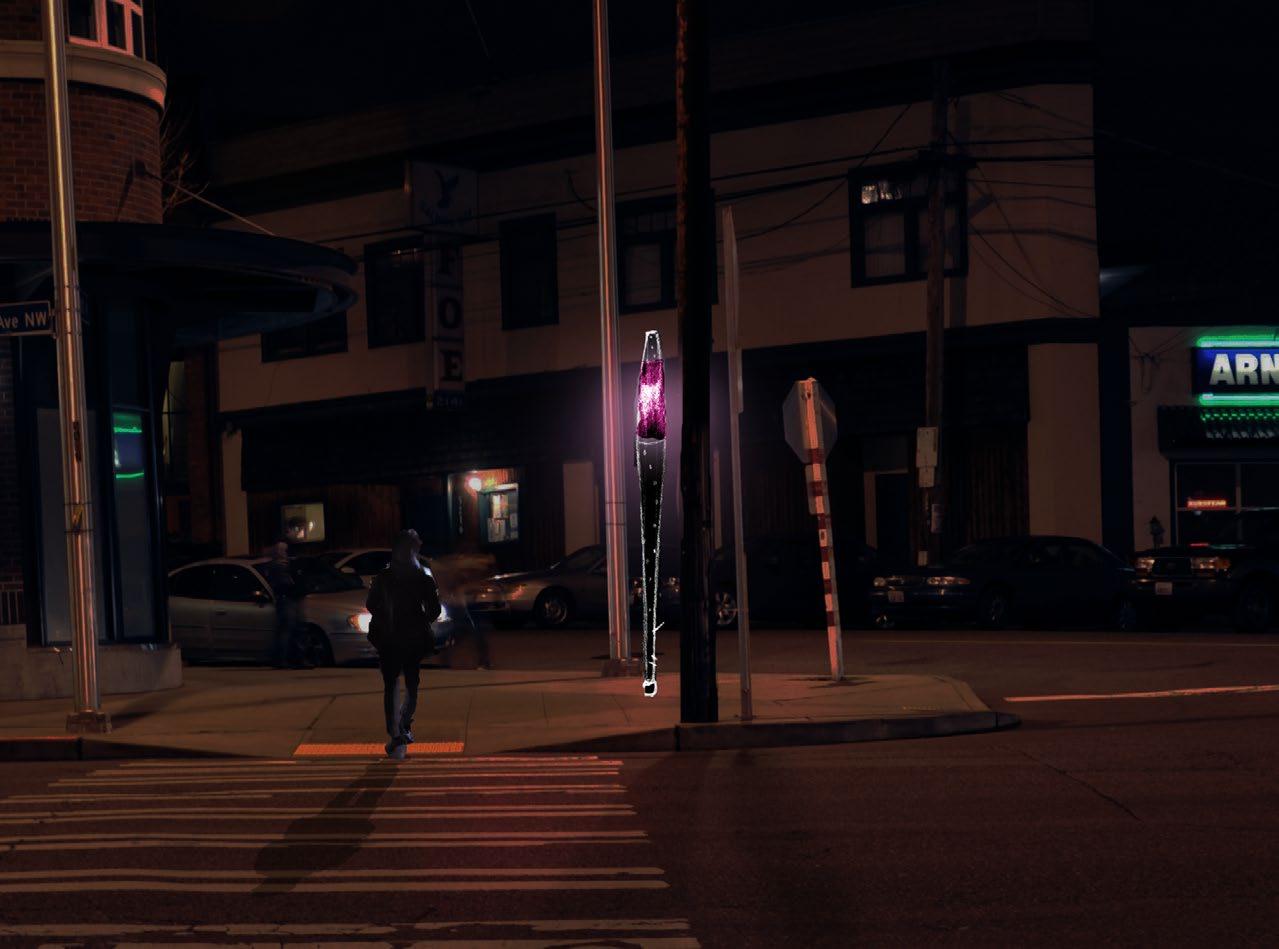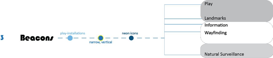 Beacons could take on many forms: freestanding vertical beacons with a narrow footprint can be placed on sidewalks at blind corners to reassure pedestrians that they are going in the right direction; neon icons attached to facades could become familiar checkpoints along a routine walk to and from the station.