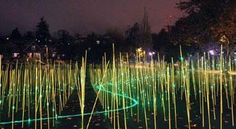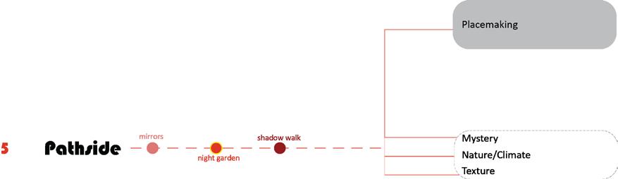 Body Zone: Underfoot, Body Level Light Intensity: Low-moderate Structure: Varies --vegetation, landscape lighting fixtures, wood & metal structures Aspects: Mystery, Nature, Texture, Placemaking Goals met: Route is defined for users, Visibility is improved while keeping light levels low, mixture of low-tech and interactive design Features: LED technology, movement-responsive design, textural materials, ecologically friendly