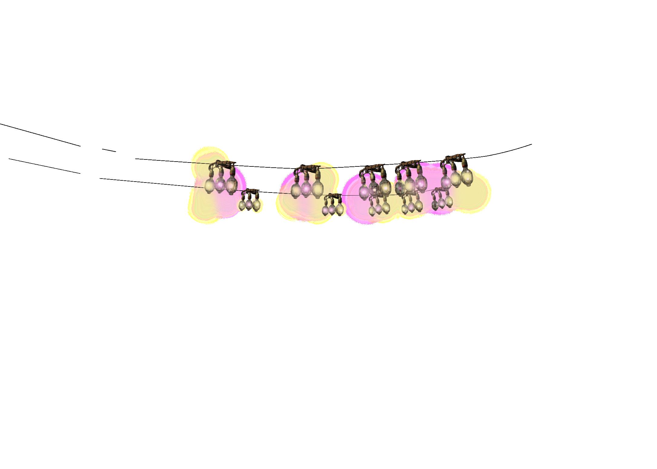 Materials: Steel poles, thin steel cable, replica squid fishing lamps, LED bulbs in pale red/yellow. / Stone pavers.