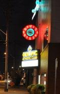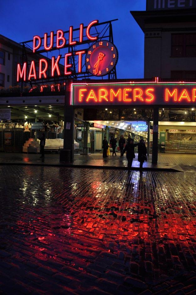 shops, and animated groups went into the Thai and Vietnamese restaurants on the other side of the street. I stayed past 3 p.m.: the farmers market had closed. The coffee shop was crowded; a few individuals sat at tables outside, seemingly content to chat in the 40-plus degree weather with hands wrapped around warm drink containers. I stayed past 4 p.m.: sunset was still an hour away, but the cloud cover and approaching dusk had already made the interior lighting seem noticeably brighter. I stayed past 5 p.m., and the changes in the scene shifted rapidly. Although there were still plenty of pedestrians on the street, the coffee shop had quieted some, and there no more readers or chatters in the chairs outside. The distinctive neon man of the Seattle Coffee Works sign, designed by Seattle-based Western Neon, lifted his orange coffee mug in a toast to the night. Streetlamps, neon signs, and shop windows glowed up and down the street, and the white lights of the trees along Ballard Avenue marked the appropriate pathways along streets that were still populated. At 5:30, the transition to darkness was complete, and I stepped outside into a new scene from the one I had left three hours prior.