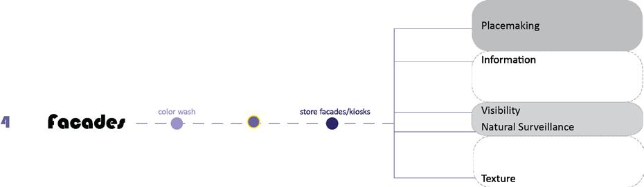 Facade interventions act on structural surfaces that are currently not engaging the pedestrian experience, either through lack of features/windows or by having darkened windows that give no sense of natural surveillance. Facade interventions take advantage of large unfeatured surfaces by treating them as a canvas for colorful architectural illumination or for still image/video projections.