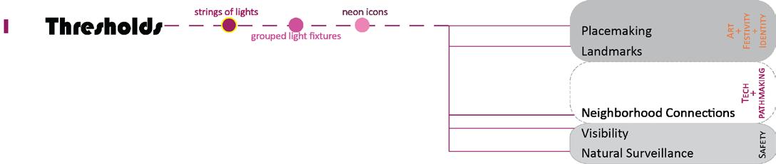 Body Zone: Overhead or at body height Light Intensity: Medium Structure: Free standing object, signage, or lighting attached to/ protruding from a facade Aspects: Wayfinding, Placemaking Goals met: District identity, Path network is reinforced, Use of individual objects rather than bright lights clarifies available routes without generating much light pollution Features: Iconic markers, colorful neon art, symbols & historical references to neighborhood character and culture