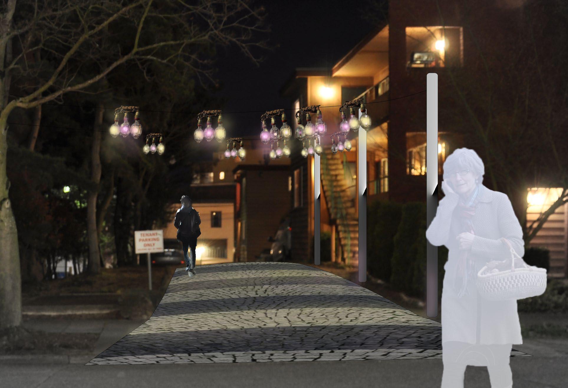 Scale: Overhead; lights positioned 10-12’ above ground and stretching about 15’ across the alley. / Underfoot, 15’ wide strip of pavers.